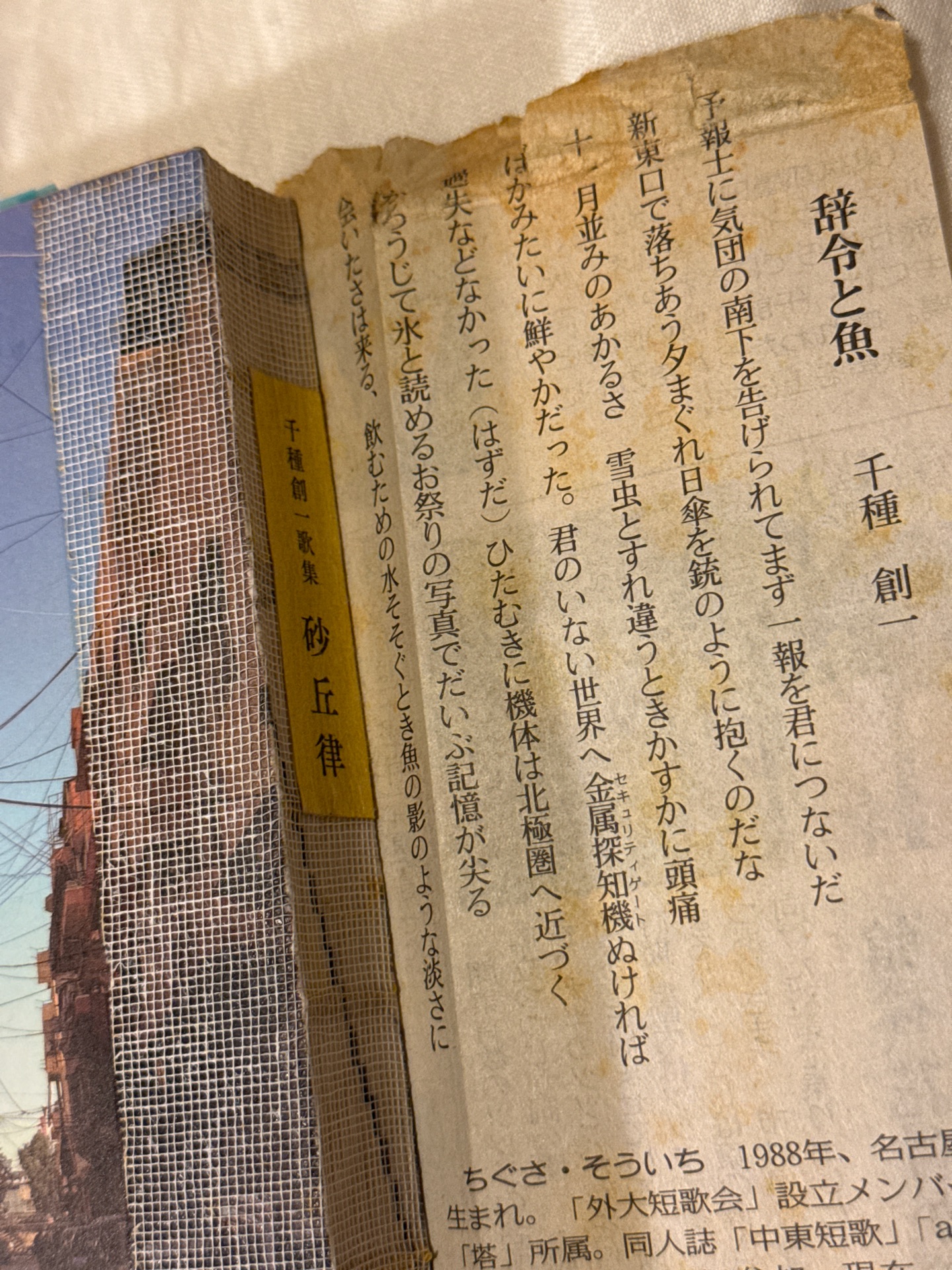 ぼぺにゃん@bopenijan_11062026年1月7日かつて読んだこの詩集が出る少し前に東京新聞に千種創一の短歌が数点紹介されていて切り抜いた。そして後日買ったこの本は付箋だらけ。 瓦斯燈を流砂のほとりに植えていき、そうだね、そこを街と呼ぼうか タバコいりますか、先輩、まだカロリーメイト食って生きてるんすか 手に負えない白馬のような感情がそっちへ駆けていった、すまない 防犯カメラは知らないだろう、僕が往きも帰りも虹を見たこと 政権を支持する友が美しくこちらへリモコンを構える アラビアに雪降らぬゆえただ一語サルジュと呼ばれる雪も氷も