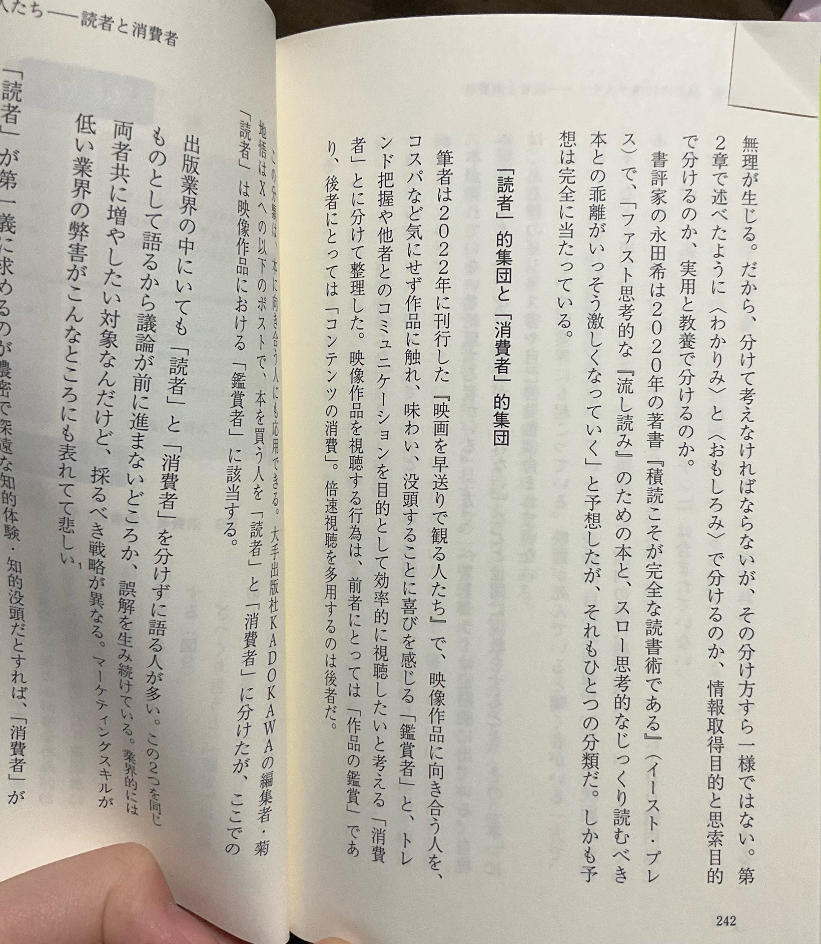 ポチ@takupochi_19932026年3月5日読み終わった「わかりみ」と「おもしろみ」、「消費者」と「読者(鑑賞者)」の整理が面白かった。 本と読書は効率が悪い。読むのに時間が掛かるし持ち運びもしづらい。単純にコスパの面で他のメディアと比べて不利。消費者にとっては効率良く便利な方が好まれる。この現実の壁を崩すのはなかなか難しい。 逆張りかもしれないけど、それでも自分は本を読みたい。客観的にコスパのいい時間の使い方ではなく、読書を通じて主観的な自分らしい時間を確保したい。 そういった考えもいずれ、いや、数年以内に古く(レガシー)なるのかもしれない。しかし、最後までできるだけ抗いたいと思った。