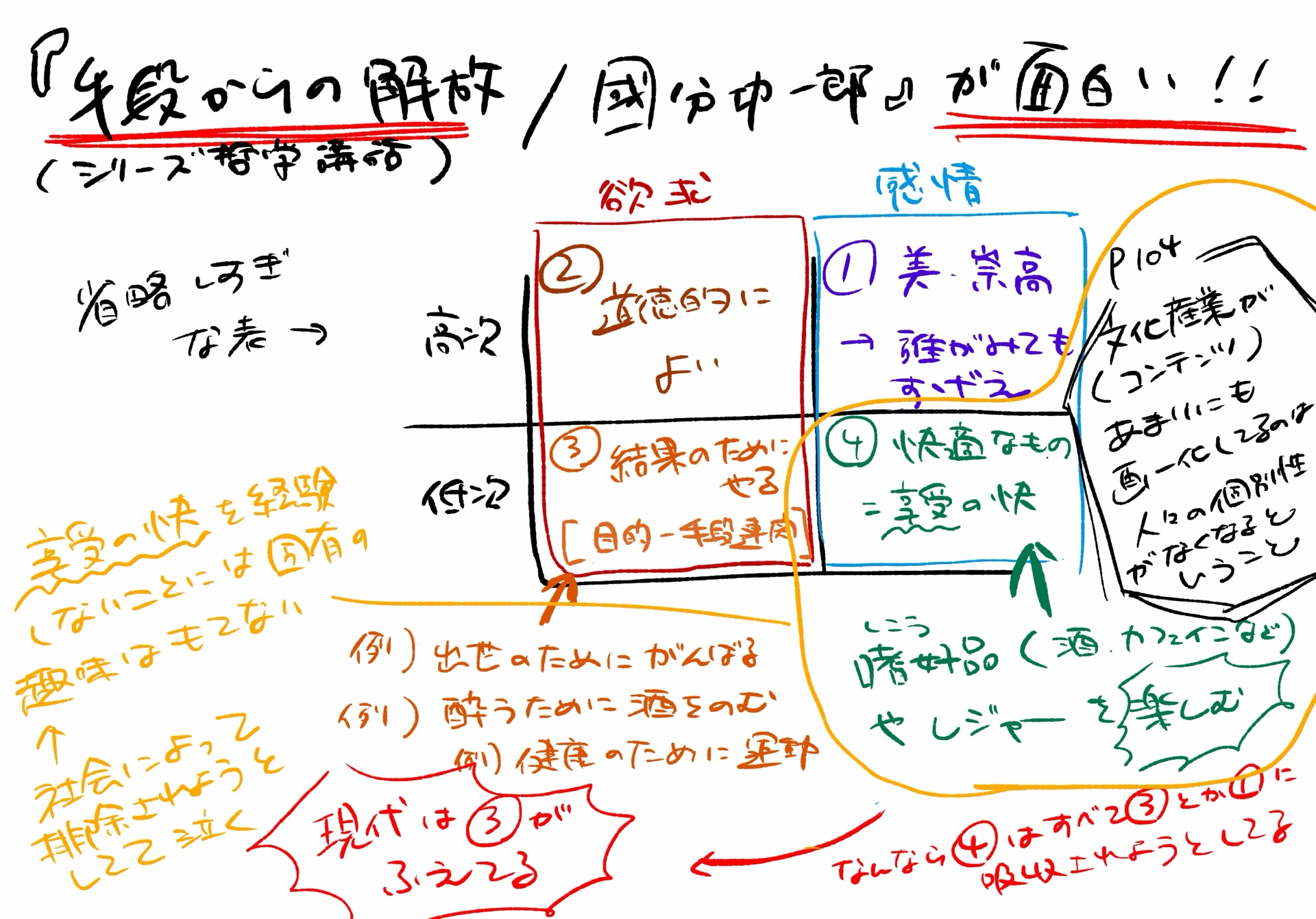 - shake@2026shake2026年3月26日読み終わったレジャーコンテンツの画一化をカント哲学と絡めて論じた、という外国の論文を取り上げており大変興味深い。 写真は自身の感覚でまとめた図。間違いあると思うので、そこも含めていろんな人に読んで貰って感想聞きたいな!と思った一冊。アディクト関連とかなり繋がっていたのでまたそういう本もまた読みたい。
