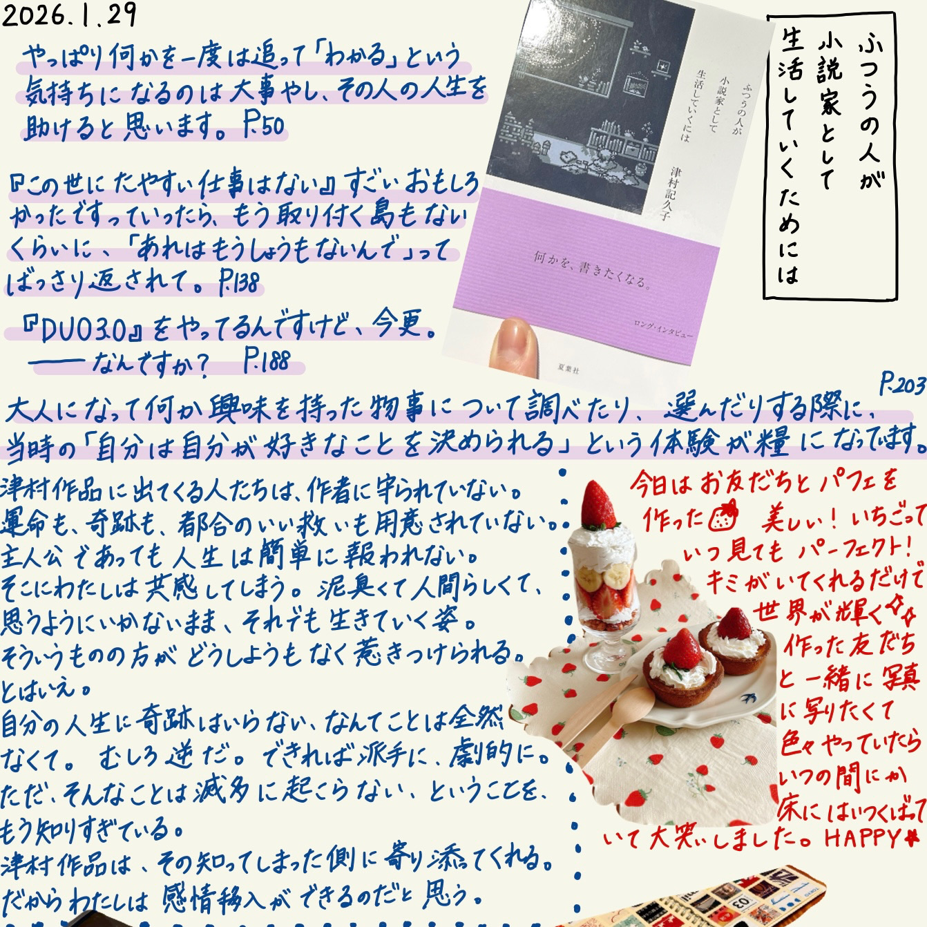 Ayako@aya_rb2026年1月8日読み始めた読書会のある週末まで待ちきれなくて、昨夜、寝る前に読み始めた。 津村さんの肉声はまだ聞いたことがないんだけれど、なぜか脳内でテンポや声のトーンが作られて、津村さんと島田さんのラジオを聴いているように読んでしまう。 一気読みするのはもったいないので、読みたい気持ちをなだめて少しずつ。