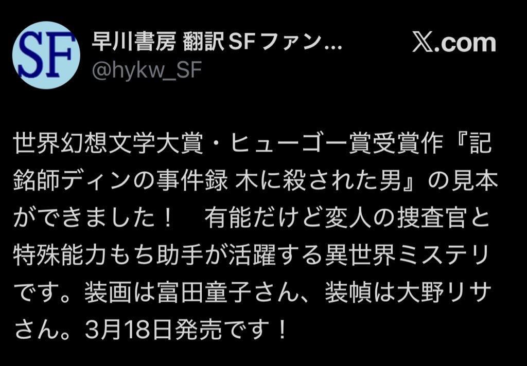 碧の書架@Vimy2026年3月2日気になる読みたい欲しい斜線堂有紀さん推薦だそうで、とても興味ある! 斜線堂さんの推薦文 「一つのミステリの為にここまで贅沢な舞台を拵えるとは。これからのファンタジイミステリはこの作品と戦わされることになる。」 作品紹介冒頭 世界幻想文学大賞・ヒューゴー賞受賞、MWA賞最終候補。『進撃の巨人』風異世界の本格派ミステリ …巨人風ってどんなだろうw 地ならし?壁?