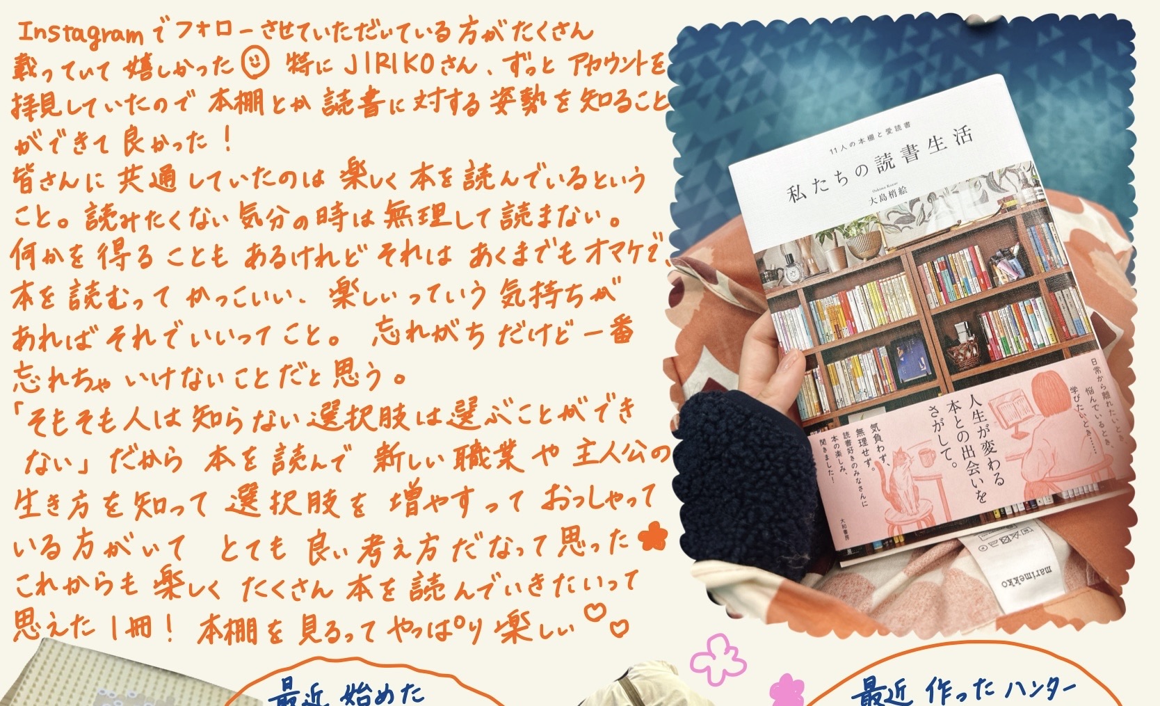 くるむ@chiru-miru2026年2月17日買った読み終わった人の本棚を見るのが大好き。本にまつわる話を聞くのが大好き。それぞれの向き合い方や、『読みたい本は惜しまず買う』『無理して読まない』などのマイルールもよかった。たくさん読んでる方たちの無理して読まない、読めないときは仕方ない、という話はとても励まされる。