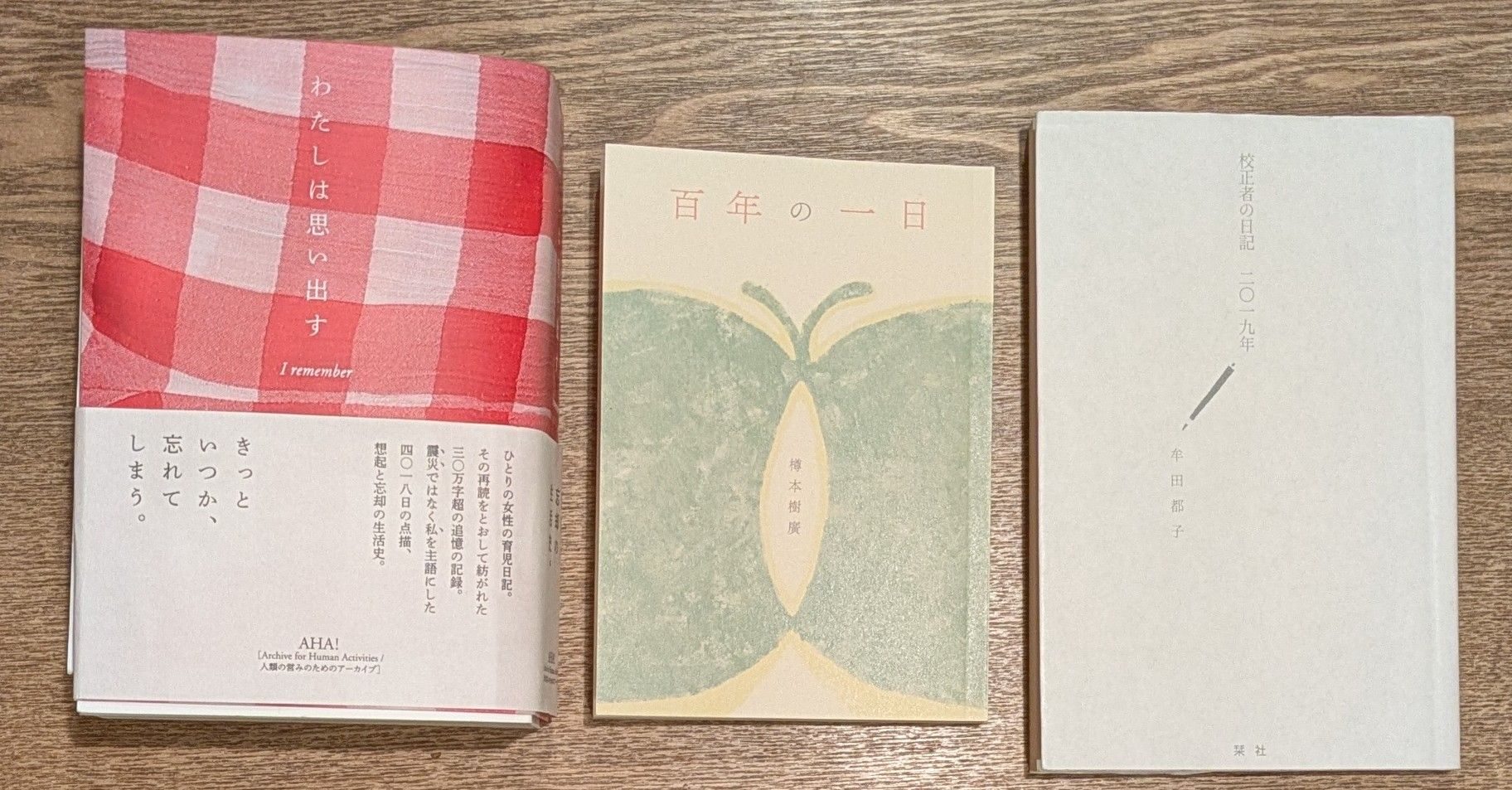 hiroro@R_hiroro2026年3月13日読み終わったかつて読んだ今月の特集は「日記」 自分は三日坊主だけど、人の日記本を読むのは好き。 写真は我が家のレア目の日記たち。 『わたしは思い出す I remember』企画AHA 『百年の一日』樽本樹廣 『校正者の日記 二〇一九年』牟田都子
