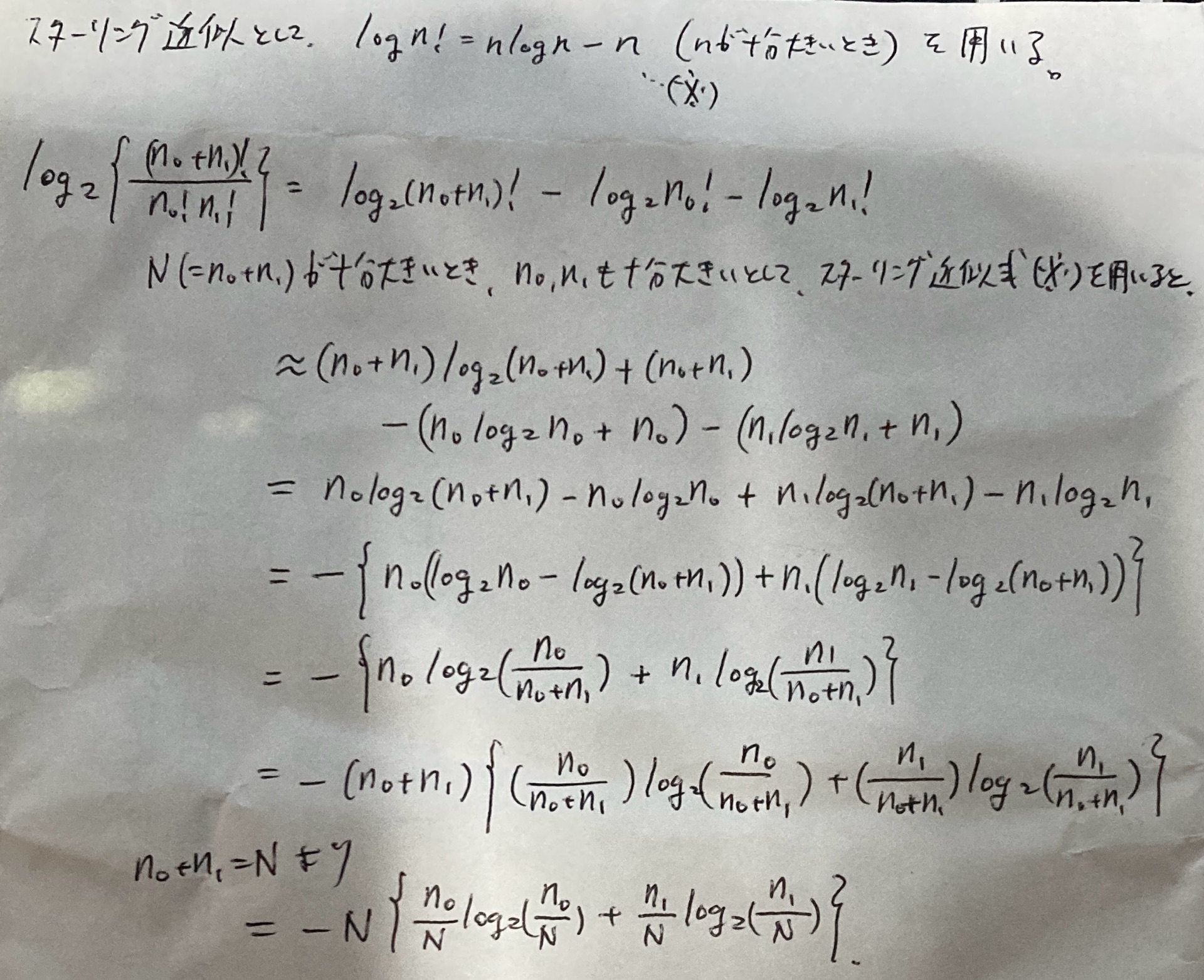 - yh@yh2026年3月22日少し読んだ古本@ 自宅第2章から読み進む。 p.84:”ある無限数列が不条理であるとは、すべての項をもれなく書き写すよりも手っとり早い定義が存在しないということ” p.85の最初の式は、組み合わせの数の式(Excel関数ならCOMBIN(N,n0)の式(=PERMIT(N,n0)/FACT(n0)) )を記述しているだけ。 p.85の次の式は、よく分からなかったのでちょっと調べてみたら、スターリング近似というのがあるらしく、これを使って式変形したら導出できた。