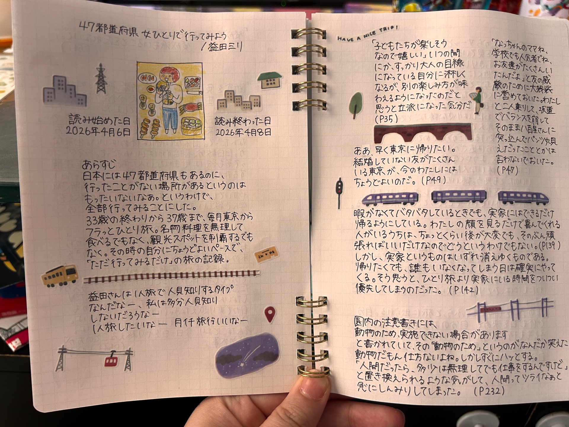 みたらしだんご@skysea8paq112026年4月8日読み終わった積読消化🌸 私もひとり旅大好きだから、いろんなところに行ってみたいなー。わたしは人とのふれあいに緊張しないタイプの人間だから、緊張する人はどんなふうに旅行しているのか、そういう人もいるんだなぁとまた一つ世界が広がった気持ち。