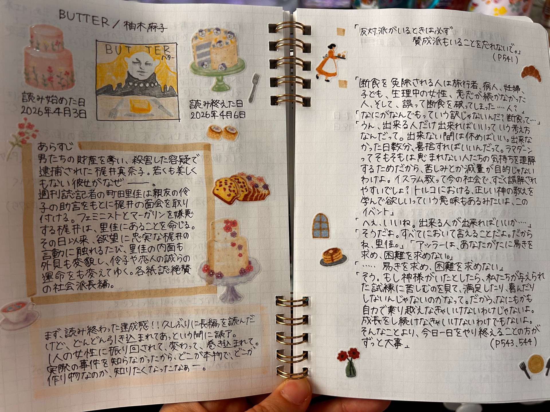 05@lesyeuxde052026年3月31日買った読み終わったタイトルの通り、バターのように濃厚でねっとり体にまとわりつくような感覚。時に官能的で、時にしつこく、胃もたれするほどの威圧感を梶井(木嶋佳苗をモデルにした人物)から感じながら読んだ。 あまりの重さに何度か休憩しながらやっと読了することができた。まるで本全体がフランス料理のハイカロリーなフルコースのようである。読者の前で調理されているのは主人公で、シェフは梶井。 メインディッシュは「本当に梶井は殺人を犯したのか?」であるが、核心に触れることはなく梶井や主人公の周縁をじわじわと炙っていくような描き方である。 いろんな1対1の人間関係が深く濃く、料理の比喩と共に描かれていくのだが、途中で比喩になっているのは人間関係の方でグルメ小説を読まされているのでは?と思うほど食への描写シーンが多かった。 恋愛、出産、キャリア、子育てなど様々な切り口で、女性がこの社会でどうやって生き残っていくのかを描いた本だった。重すぎて内容の詳細は忘却の彼方へ…🪽