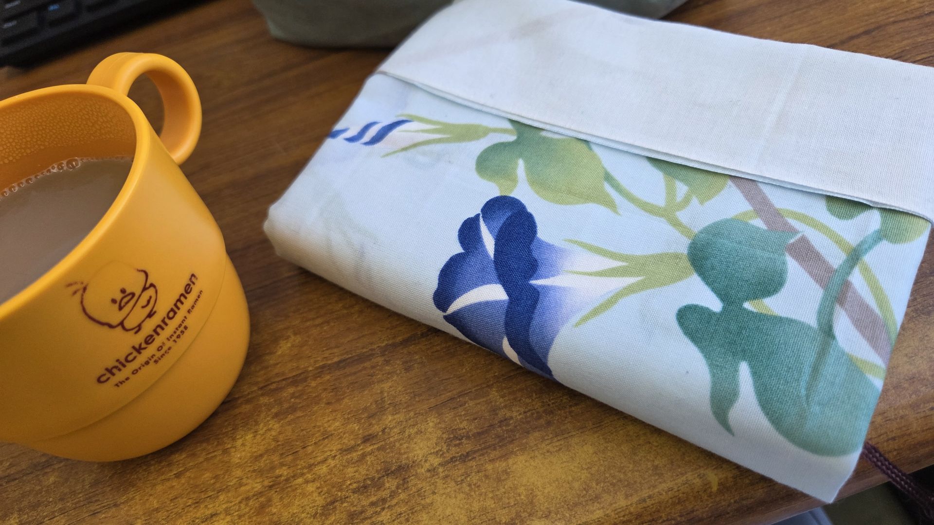 海の怪物クラーケン@K16592026年3月25日読んでる@ 電車以前に朝顔の手拭いを買ったことを思い出し、初めてブックカバーとして着けてみた。やや不格好なりにも愛着持てる。読み初めて、前田慶次に期待したものが(当たり前だが)早々に数々お出しされて、ずっと嬉しい。読み進めるのが楽しみで通勤が少しばかり楽しみになる。通勤だけ。