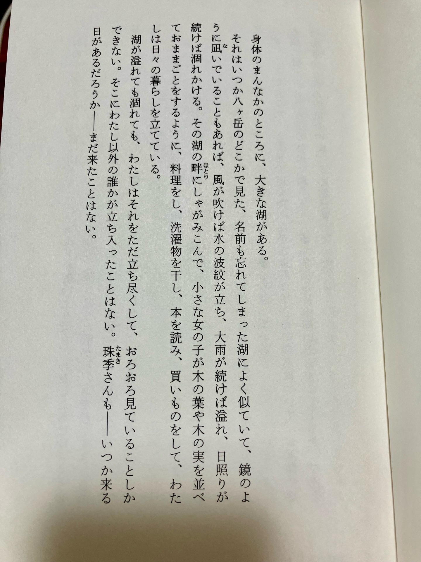 ふるえ@furu_furu2025年8月28日読んでるたゆたうように言葉を辿っていく。体の中に湖が生まれる、というところで自分に感覚が戻って、僕の中には何があるんだろうと思う。現実の感覚の中にはない、自分だけの時間と風景が生まれるというのはどのような感覚なのだろうか。