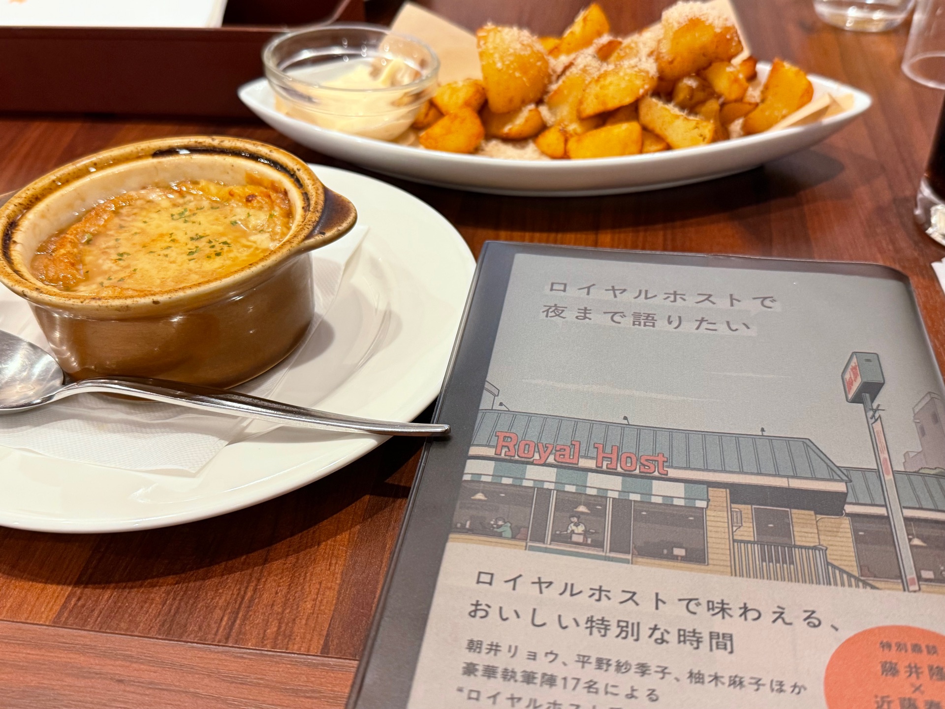 rep@toponder_r2026年3月9日読み始めた読んだら行きたくなっちゃった〜 食べたことないオニオングラタンスープ! あとはフェアの北海道のポテト! 美味しかった〜!!贅沢! BGMや閉店のときの「テールランプが…」も聞けて大満足!