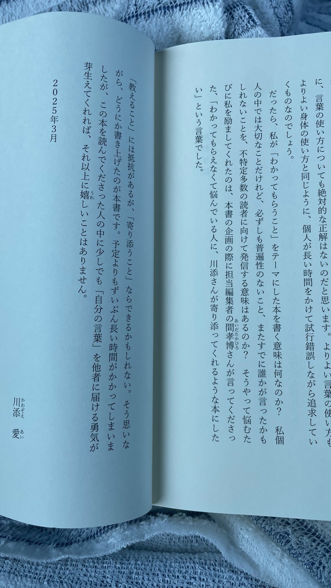 うみ@kaich12202026年1月1日読み終わった今まで出会った本の中で片手で数えられる中に入る内容だった。出会えてよかった。どんな感性、言葉の温度、生き方、気の遣い方を持っているかによって、感想が変わりそう。自分の最近の出来事と重なったからか、鋭く苦しい記述もあったけど、納得感があり、意識して過ごしてゆきたいと思える内容だった。あとがきの「わかってもらえなくて悩んでいる人に、川添さんが寄り添ってくれるような本」という言葉も好き。自分の現実と重ね合わせて読み進めて、悩みの解像度を上げることができた。心が軽くなった。