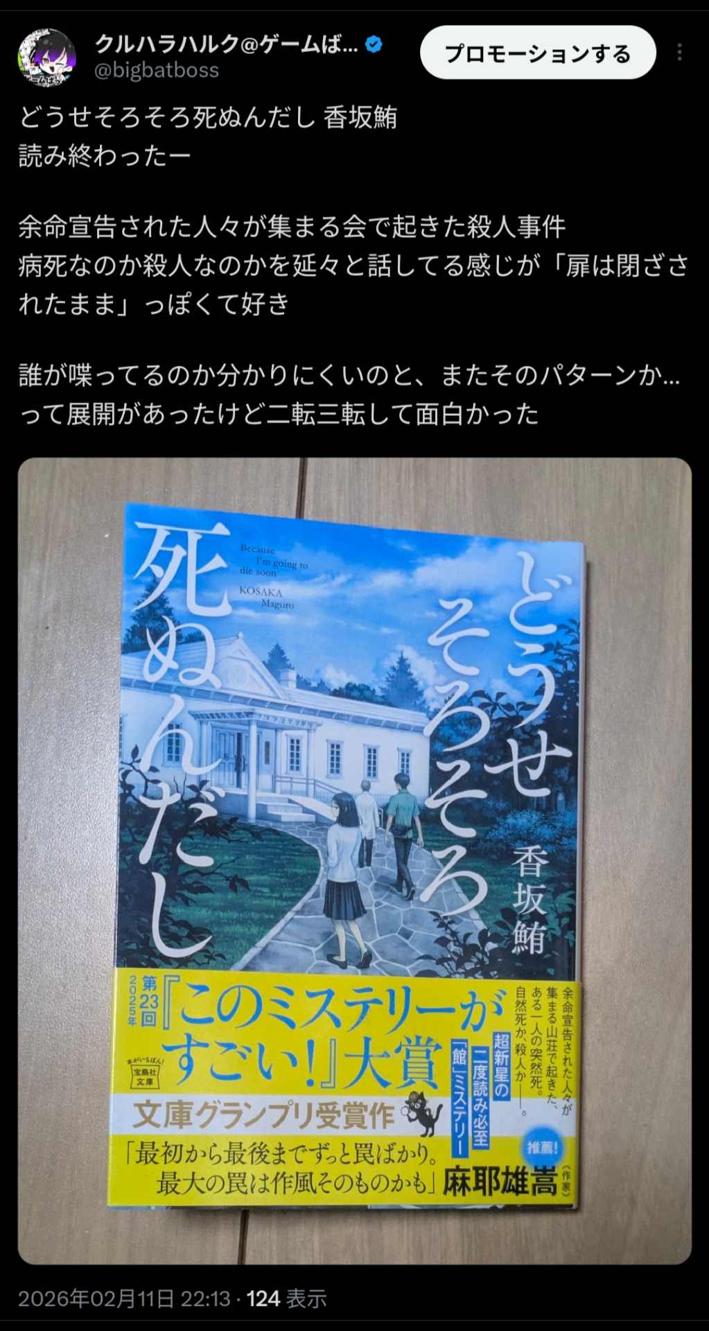 クルハラハルク@Kuruharahuruk2026年2月11日読み終わったどうせそろそろ死ぬんだし 香坂鮪 読み終わったー 余命宣告された人々が集まる会で起きた殺人事件 病死なのか殺人なのかを延々と話してる感じが「扉は閉ざされたまま」っぽくて好き 誰が喋ってるのか分かりにくいのと、またそのパターンか…って展開があったけど二転三転して面白かった