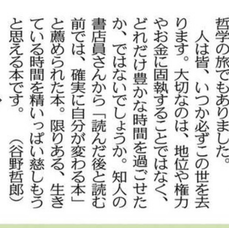 れおぴん@leopin08012026年3月8日中日新聞 書評 2026.3.8 @谷野哲郎さん 知人の書店員さんから「読んだ後と読む前では確実に自分が変わる本」と薦められた本。 ・・・限りある時間を慈しむ