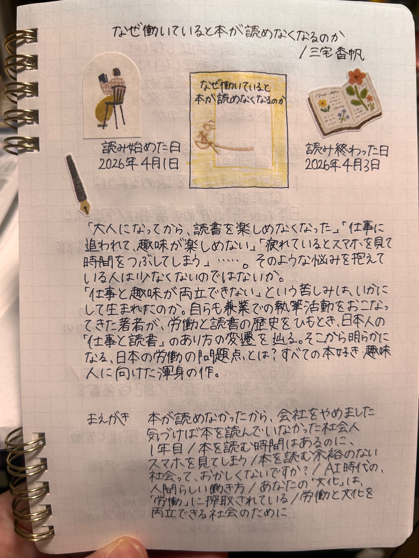 - ヒナユ@abesanzuu32026年4月11日読み終わった「なぜ働いていると本が読めなくなるのか」を日本の労働の歴史を振り返って紐解いていくのは読み応えあった。円本とか初めて知ったよ。勉強になる。 後働きながら本を読むコツが共感しかなかった。 気に入った読書アカウントをSNSでフォローするのはよくわかる。SNSではないけど自分も好きな動画配信者のオススメ本をよく読むし。わりとこれだってのを勧めてくれるから忙しい時に選ぶ手間が省けるよね