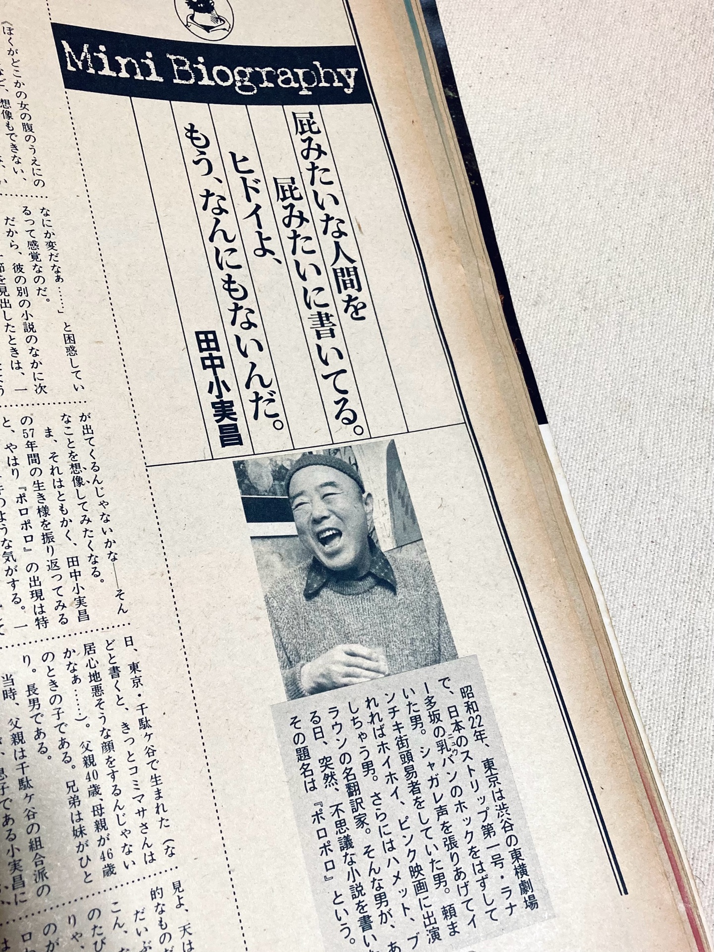 DN/HP@DN_HP2026年4月1日「小実昌自身、微妙な拒絶反応がありながらも、心のなかでポロポロを理解してたんだろう。いや、それは”理解”なんてもんじゃない。”直観”、ベルグソン流の“直観”による認識方法だろう。これは『ポロポロ』や『イザベラね』なんかを読んでもらえばわかることだけど、彼の小説が、言葉を疑っているような、物語ることを拒むような奇妙な言いまわしの文体にならざるを得ないのも、かつて父親のポロポロを前にして深く傷ついた、と同時に深く”直観”した彼の体験に遠く起因するのではないか。 『いま書いてるのなんかヒドイよ。もう、なんにもないよ。もう、ワタシャ、どんどん売れなくなって…』この田中小実昌の呟きの、書いてる”って部分を祈ってる”と置き換えてみていただきたい。 タナカ・コミマサは、要するにポロポロなのだ。曖昧な言葉で物事をゴマカスのが嫌なのだ。もつと内奥から突きあげてくる言葉にならない言葉でストイックに伝達したいのだ。でなければ、どうやって戦争体験など表現できようか。 戦後、実にさまざまな職業に首を突っ込み、そして30年以上たってやっと『ポロポロ』が書けたのも、言葉にならない言葉がポロッと湧き起ってくるのを待っていたからなのだろう。こんなにマジメなニンゲン、見たことがない。」 —BRUTUS 1983 2/15 〈ブルータス流読書指南〉 伊藤精介 Mini Biography 23