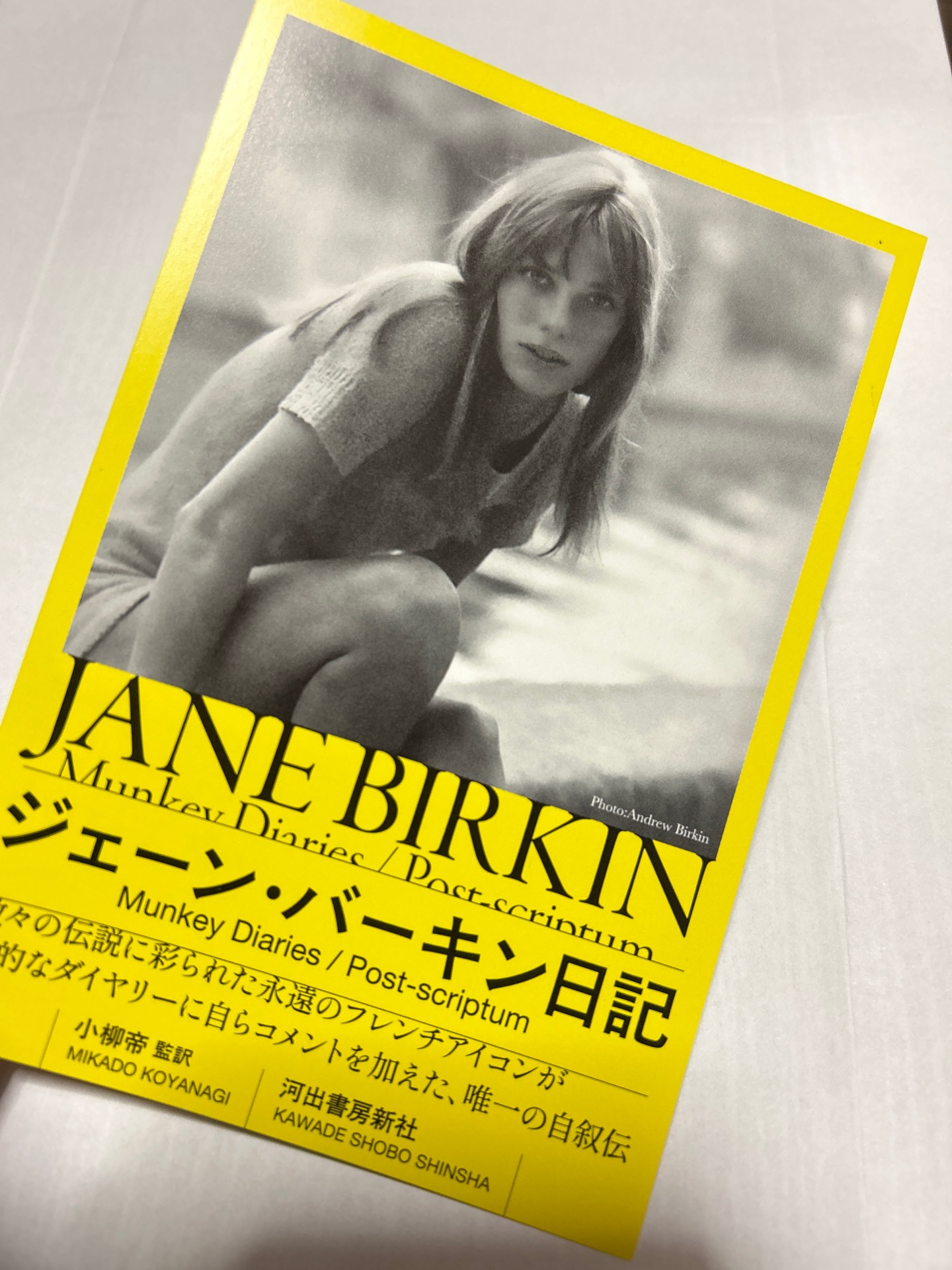 この女優に特に興味があるわけではなく。 ジェーン・バーキンが実際に使用していたエルメスのバーキンを、日本のブランド品買取業者が858万€(14.7億円)で落札したとのニュースを今朝 読んだばかり。で、今日、本屋で葉書を見つけた。
