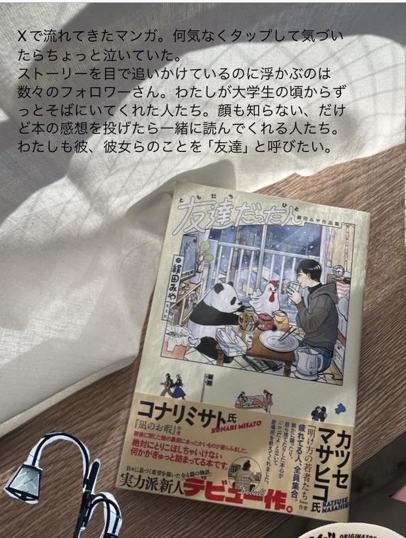いずみ@moritaizumi2025年12月26日買った読み終わった漫画❤️ネットで表題作の試し読みをして、ずっと気になっていた短編集。買ってよかった。表題作「友達だった人」は、再読でも号泣してしまった。 ちょうど今日、ネットで読んだ、「言葉にできない自分の感動」みたいなことをすごく感じる漫画だった。言語化したい気持ちも、したくない気持ちもある。