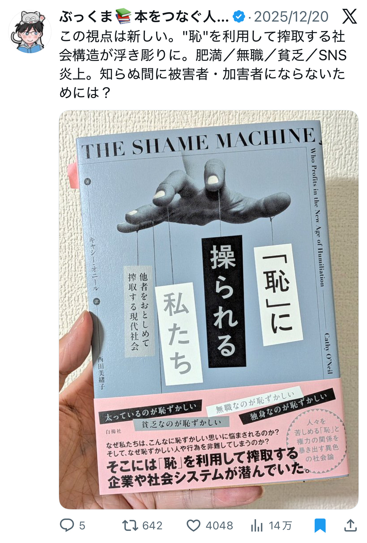 nessie@nessieayako2025年12月31日読み始めた数学者の筆者による、「恥を利用した搾取」にまつわる社会論。肥満を揶揄されたときの強い衝撃を「二重顎を平手打ちにされたような衝撃」という言葉に落とし込んでいるところ(別の無難な言葉ではなくあえて「二重顎」を挿入してくるところ)、細部に宿る筆者の気概を感じてなんだかとてもぐっときた。 一文の情報量が多く、正直私にとってはするする読める筆致ではないのだが、挫折しないで読み進めたい。