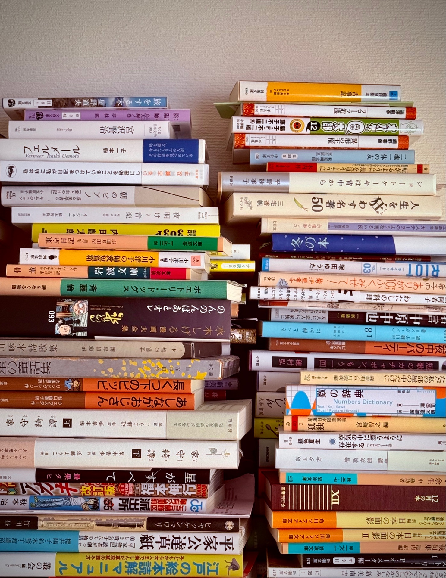 一歩も外へ出ないと決めて本の山を眺める平和な午後、楽しいな〜 本棚の整理もしなくちゃと思うけど混沌とした中から本を選ぶ時間もまた良し。