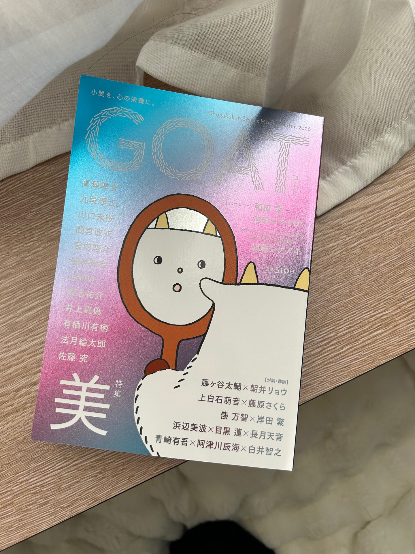 umi@sym12032025年12月13日また読んでるお風呂読書噂のGOAT、ずっと気になっていたけれどなかなか入手できず、やっと購入に成功。 これまで文芸誌を読んだことがなかったので、 ひとつのテーマについて、人気作家の方々が書かれた作品を、(おそらく)書き終わってそんなに日が経っていないタイミングで読めるなんてすごい!と目から鱗の感覚。 そりゃ世の中に文芸誌が沢山あるわけですわ。他の文芸誌も読んでみたくなった。 そんな感動を与えてくれたGOATはこれからは毎号買うと思う。 今号のテーマは「美」でした。 小説以外の企画も面白く読んだ。