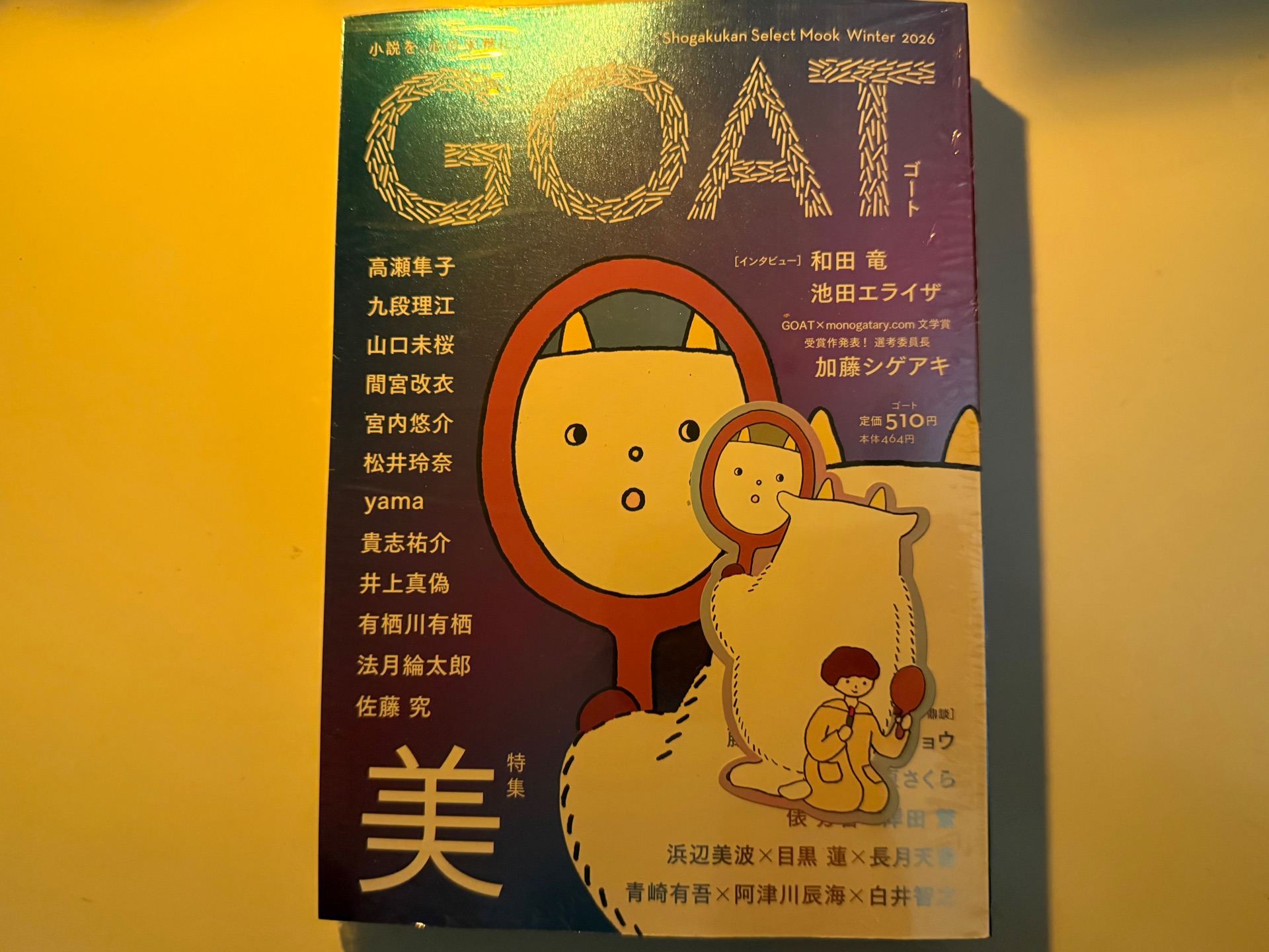 ブックスエコーロケーション@books-echolocation2025年12月12日新刊入荷@ ブックスエコーロケーションブックスエコーロケーション、12月12(金)open。11‐18時。ご来店お待ちしてます。 『GOAT 2026 Winter』小学館 話題沸騰の文芸誌、GOATの第3号!特集は「美」 純度100%の面白い小説を詰め込んだかつてない文芸誌。 なんと定価510円。今号は表紙がキラキラでかわいいです!