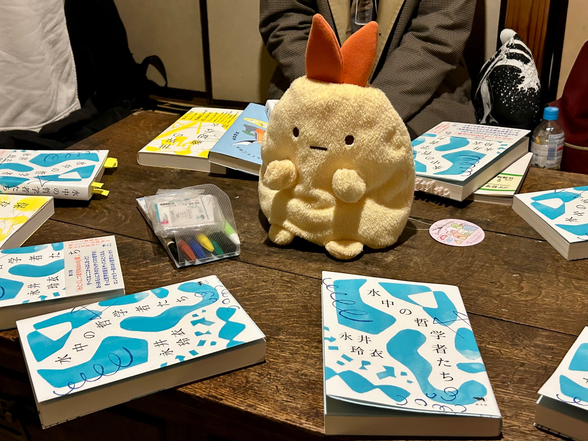 熊谷の太原堂で『水中の哲学者たち』の読書会&哲学対話に参加してきました〜📚 真ん中にいるのは、哲学対話タイムで話し手の人が持つぬいぐるみ(すみっコぐらし)。
