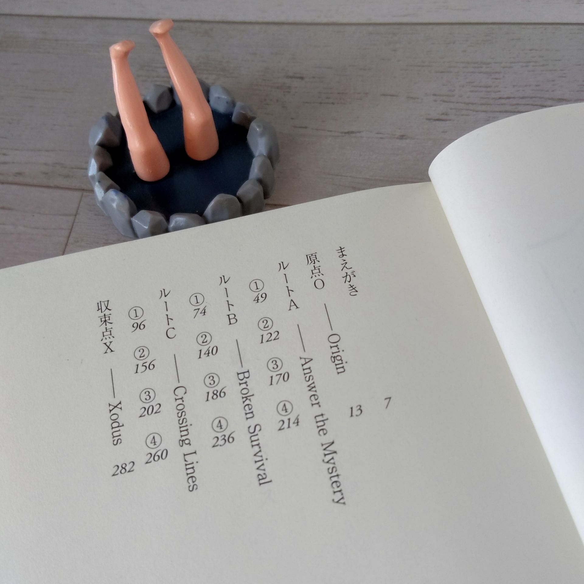 流血マルチバース五条紀夫ミステリークローズド・サークル読み終わったお気に入り島に到着後に事件発生、そして突然の分岐! 3つに分かれたルートの中から好きなルートを選んで読み進むゲームブックのような作り。 それぞれのルートが絡み合ってて面白い! そして3つの世界線に分かれた話が、 最後に収束する。 1冊の中に3つの流れが入っているので、 1つの話が短めでテンポがいい。 笑わせて悩ませて最後はちょっと切なくなるような 情緒が大変忙しくなってしまう すごいいいものを読ませていただきました! 大好物です!! 五条さんオカルト作家やったんや…🤣 (言われてみればたしかに??)