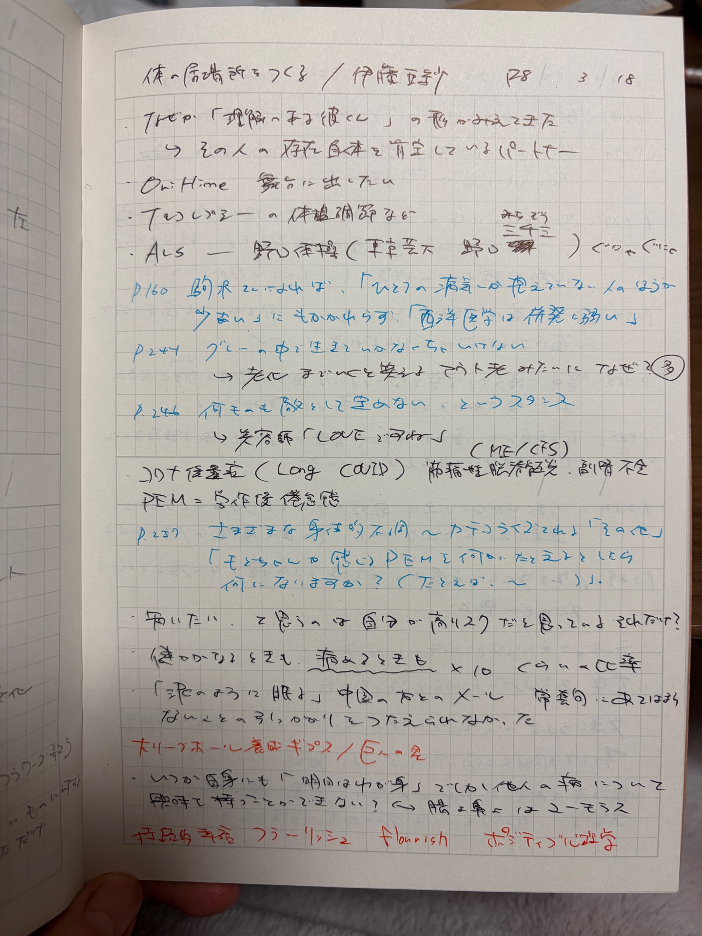 体の居場所をつくる伊藤亜紗読み終わった久々に夜更かしして夢中で読んだ! いろんな当事者の方々のパートナーの立ち位置や振る舞いが多様で。パートナーゆえおおらかを強いられているというわけでもないけど、当事者が取材を受けるまでの信念を持った方々であるがゆえの芯の強さというものがあるのかなと少し感じた。
