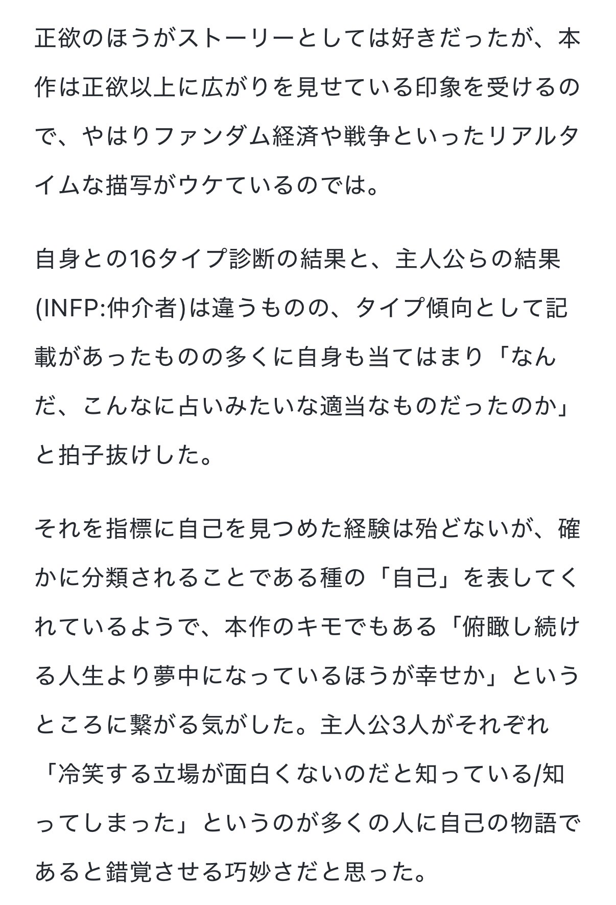 イン・ザ・メガチャーチ朝井リョウ読み終わった感想はメモ画像にて。 最近読んだ本&読んでる本で、 「華氏451度/レイ・ブラッドベリ」 「手段からの解放/國分功一郎」 「FACTFULNESS」 がどれも本書と似た提起や描写をしており、最近の主題なのか自身のブームなのかどっちなんだろなと思った。