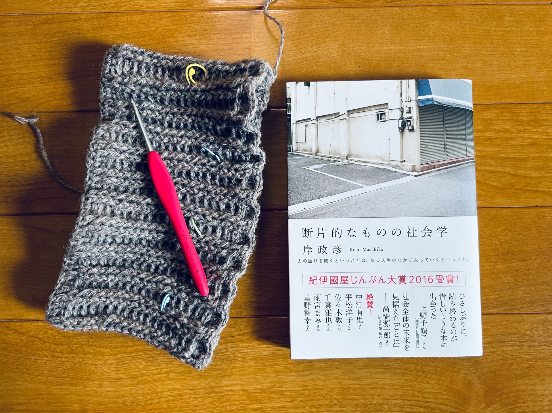 断片的なものの社会学岸政彦わたしの本棚編み物を始めて数年、今も不思議に思うことがあります。羊の細い糸を編むと、それが布になり、手間をかければ鮮やかな模様が浮かび上がる…思いもしなかったことが、目の前に拡がる 岸さんの語り口は誰かに似ている…ここまで出掛かっているのに、まだ誰か思い出せません。でもその語り口は頭に心にスッと入ってくる。何も押し付けることなく、身体に染み込む感じ 幾つものテーマが語られますが、「誰にも隠されていないが、誰の目にも触れない」一節が妙に忘れられません 『だが、世界中で何事でもないような何事かが常に起きていて、そしてそれはすべて私たちの目の前にあり、いつでも触れることができる、ということそのものが、私の心をつかんで離さない。(中略) そして、だからこそ、この「誰にも隠されていないが、誰の目にも触れない」語りは、美しいのだと思う。徹底的に世俗的で、徹底的に孤独で、徹底的に厖大なこのすばらしい語りたちの美しさは、一つひとつの語りが無意味であることによって可能になっているのである。』 世知辛い昨今、自分のことに精一杯で、他人に無関心になりがち…そう感じることが多々あります。人それぞれには物語があり、取るに足らない話であっても、何かを感じる。そういう感覚を忘れてはいけないなぁ、そう思うことも少なくありません 大袈裟に聞こえるかも知れませんが、編み物を始めて少し人生観が変わったことがあります 毛糸は眺めていても、一本の糸のままで何も変わりません。でも編むことで、それが布や柄へと新しい形に変わります 他者との関係も同じなのかも知れない。こちらから一目でも二目でも編むことで、全く違う関係を築くことも出来る、そんな風に思い始めています