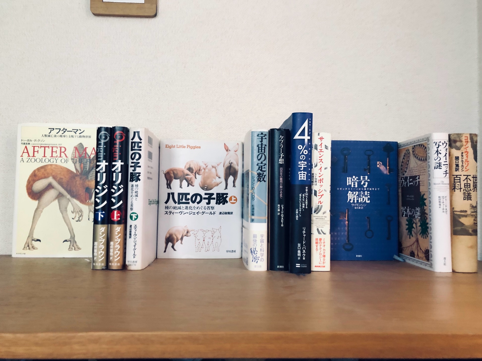 おかしな本棚クラフト・エヴィング商會わたしの本棚『あるとき、どうも自分は本が好きなのではなくーーいや、もちろん本も好きなのですがーー本当に好きなものは本をおさめた本棚や本立ての方ではないかと気がついた。そこには本が並んでいるということ。一冊ではなく、二冊、三冊と背中を並べていること。その並びが、どんなふうに並んでいるのか、どの本とどの本が隣り合わせになっているのかーー。』 . こんな素敵な文章で始まる吉田浩美さんと吉田篤弘さんの本 ご夫婦の蔵書をテーマをつけて並べられた美しい本棚の写真がたくさん掲載されています . 私も本棚が好きという感覚は、とても共感出来るもので、家の本棚も作者別ではなくテーマ別で結構並んでいます。何故この本の隣にこの本を置いているのか、それは私しか知らない秘密。独立書店に行った時に棚の並びを見るのが好きなのも、店主の秘密を探りたい…そういうところにあるのかも知れません . 吉田さんに倣って、家の本棚の一部を紹介します . 「科学大好きの本棚」 . 『世界不思議百科』コリンウィルソン 関口篤訳 青土社 『ヴォイニッチ写本の謎』ゲリーケネディ ロブチャーチル 松田和也訳 青土社 『暗号解読』サイモンシン 青木薫訳 新潮社 『サイエンス・インポッシブル』ミチオカク 斉藤隆央訳 日本放送出版協会 『4%の宇宙』リチャードパネク 谷口義明訳 ソフトバンククリエイティブ 『ケプラー予想』ジョージGスピーロ 青木薫訳 新潮社 『宇宙の定数』ジョンDバロウ 松浦俊輔訳 青土社 『八匹の子豚 上下』スティーヴンジャイグールド 渡辺政隆訳 早川書房 『オリジン 上下』ダンブラウン 越前敏弥訳 角川書店 『アフターマン』ドゥーガルディクソン 今泉吉典訳 ダイヤモンド社 . 暗号、物理、宇宙、進化論、オカルト…非常に偏った本ばかりで誰も興味ないと思いますが、科学好きには堪らない本ばかりなんです。『オリジン』はエンターテイメント小説で科学書ではないと言われそうですが、小説に登場する科学者、ジェレミーイングランドは実在の方で、この方が提唱する「エントロピー仮説」ー生命の誕生に関する仮説ーは、唯一この小説でしか紹介されていないので、この本棚に並べています . 人それぞれ、人の数だけ本棚があると思います。皆さんの本棚のテーマも教えてくださいね