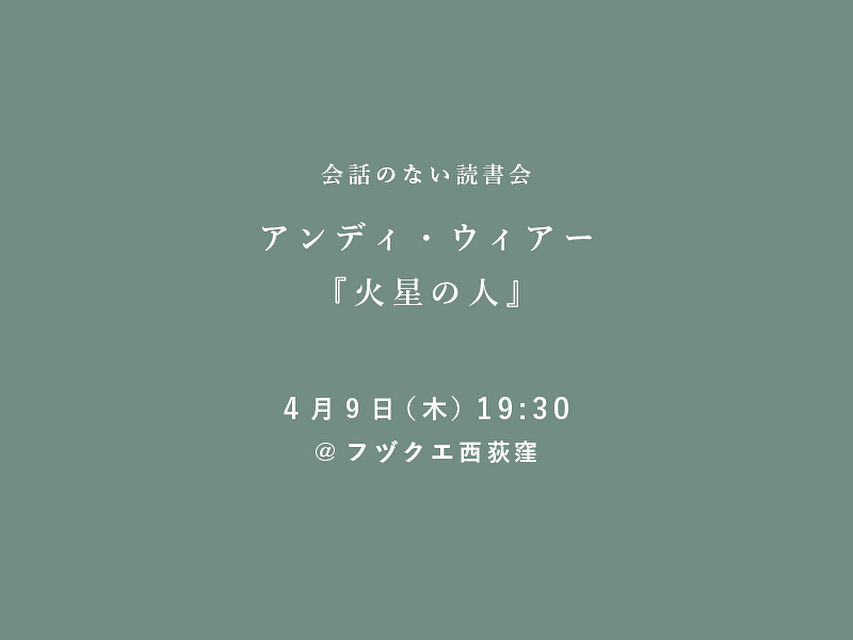 火星の人〔新版〕 上アンディ・ウィアー,小野田和子会話のない読書会@ 本の読める店 fuzkue西荻窪その本を読むためだけに用意された、贅沢で最高の読書時間—— 「会話のない読書会」は、楽しみにしていたその本を、同じくその本を楽しみにしていた人たちだけが寄り集まった空間でただただ読む、という読書会です。 この読書会では、参加者同士が本について語り合ったりすることはしません。映画館で映画を観るように、おのおのの席で、黙々と、ただ読む。コーヒーやお酒や食事を楽しみながら、決められた時間のあいだ、ただただ読む。時間になったら帰る。 参加者たちは見知らぬ者同士のまま、「ここにいる全員が今、同じ本を読んでいる」という認識だけが渦を巻く。ただそれだけが、どうしてだか忘れがたい、濃厚かつグルーヴィーな体験に、なれ、という企てです。 西荻窪店主からのご案内です。 ーーーーーーーーーーーーーーーーーーーーーー 映画「プロジェクト・ヘイル・メアリー」が好評なので、久しぶりに原作を読みたい! となったのですが、「会話のない読書会」ではとりあげたことがあるので、原作者の別の作品を読みます。 火星探索の事故で、ひとり火星に取り残されたマーク。 はたして彼は、無事に地球に戻れるのかー というベストセラーSFです。 店主もこれから読みます。 どんな冒険が待っているのか、わくわくしますね! 翻訳は早川書房から出ています。 https://www.hayakawa-online.co.jp/shop/g/g0000613962/ 原文で読むよ、という方は、英語でどうぞ。 📝 開催概要 ■日時 4月9日(木) 19:30~22:00(19:00開場) ■場所 フヅクエ西荻窪 ■読む本 アンディ・ウィアー 『火星の人』 ※ 本はご用意ください ■料金 2420円(税込) ※ 3オーダー付き ※ 基本メニューのほか、追加料金でお食事などのオーダーもしていただけます。カレー、サンドイッチやチーズケーキ等、いろいろあります。 ■予約 https://fuzkue.com/news/1843 予約は当日まで受け付けています ■定員 10名