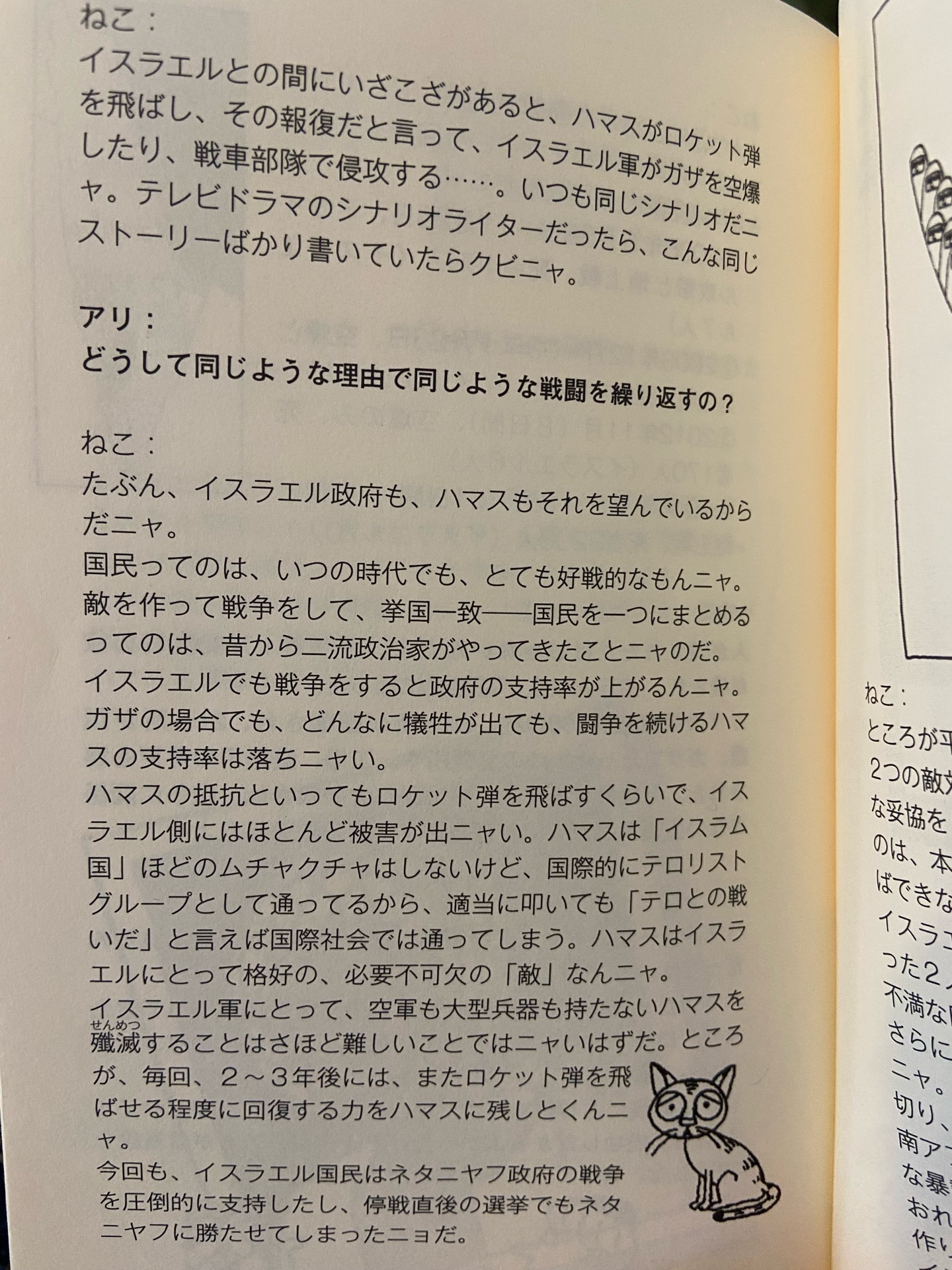 まんが パレスチナ問題山井教雄普段ニュースに接していると、どうにもパレスチナ寄りの報道が多く、そんなにイスラエルは悪魔なのか?と常々疑問に思っていたのでその背景を知りたく読んだ。各宗教と国々の数千年にわたる歴史が複雑に絡み合い、一読しただけではなかなか理解が追いつかなかったが、ざっくりと流れを掴むことはできた。根本的には国家と宗教に対する執着が、このような悲劇を生むのだとよくわかった。 パレスチナ寄りの報道が目立つのは1988年前後のインティファーダ(パレスチナ人による民衆蜂起)→PLOアラファト議長による国連スピーチ→ノーベル平和賞受賞あたりからの流れか?しかしアラファトが実はクズ人間すぎて(世界からの援助金で私腹を肥やし、後継者をわざと作らず)、驚いた。 本書は20年前のものだが状況はたいして変わっていないような。続編も借りたので読む。