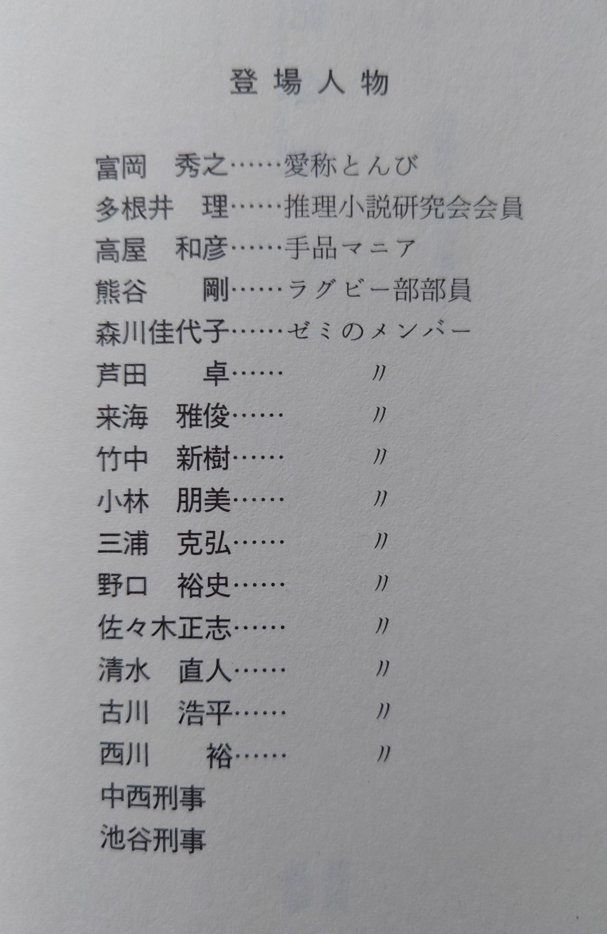 記念樹依井貴裕読み終わった買った蔵書読み返し中 大学生の推理小説研究会員、多根井理と警察官志望の友人で語り手、とんびのミステリ ファックス付固定電話や公衆電話ボックス出てくるのが懐かしい 人好きのする笑顔を浮かべている人当たりのいい探偵 大学生視点とゼミ仲間の話のためか、ジュブナイル読んでる気分にもなる