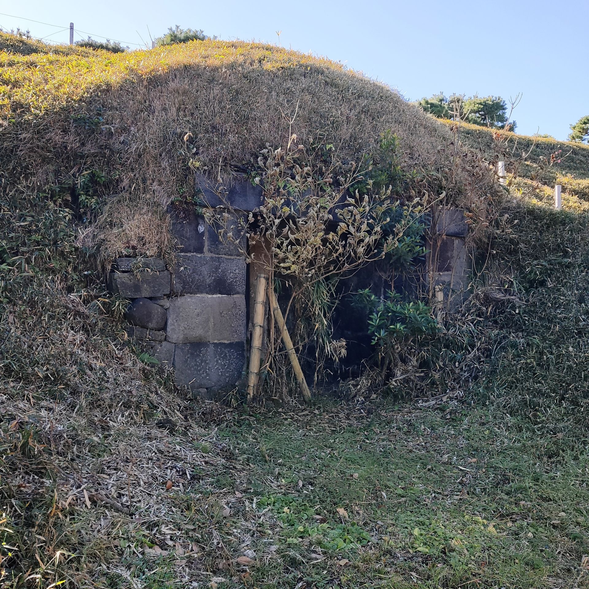 続日本100名城公式ガイドブック スタンプ帳つき日本城郭協会行ってみた本を参考に品川第三台場へ。黒船来航を受けて慌てて造営された海上砲台の1つ。「佐賀藩などで鋳造した洋式大砲が配備されて」(p.67)いたそう。写真は火薬庫跡。 埋立地のいかにも人工的なビーチを歩いた先、あのSFチックなフジテレビ社屋を対岸に望む場所に、江戸時代末期のこんな遺構が残されているのはおもしろい。