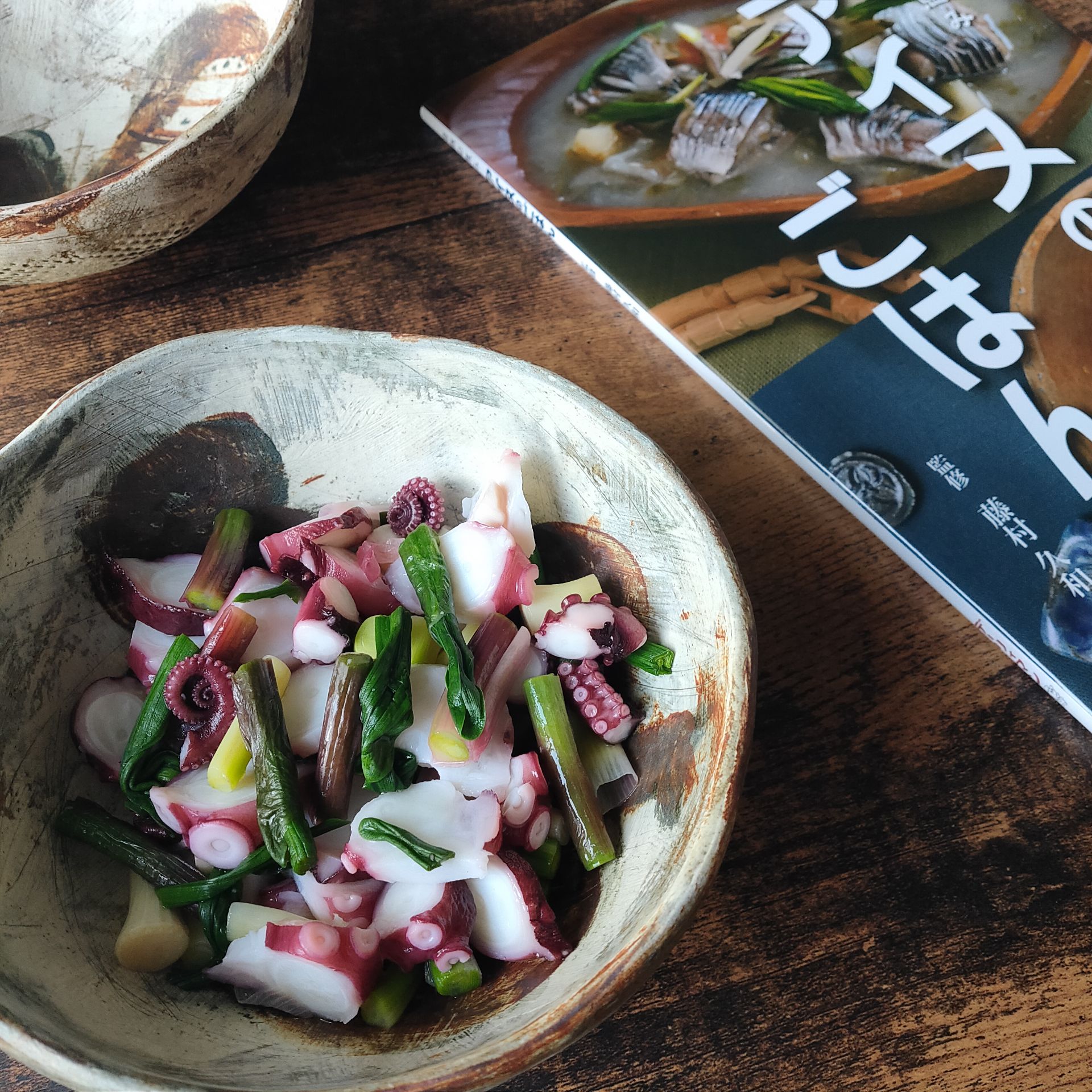 アイヌのごはん: 自然の恵み藤村久和つくって食べた「たことぎょうじゃにんにくの塩酢和え」p.46 を作ってみた。 アイヌ語で行者にんにくはプクサ、和え物はラタㇱケㇷ゚と呼ばれる。味つけは酢と塩だけで、シンプルでさっぱりしていた。 行者にんにく自体、初めて食べたかも。香りが強い。この本のいろんなレシピに使われているしアイヌの人たちにとっては身近な山菜だったのだろうけど、スーパーで買うとそこそこ高かった。 かじか汁をつくってみたい。必要なものはかじか丸ごと1尾と、こんぶと塩。