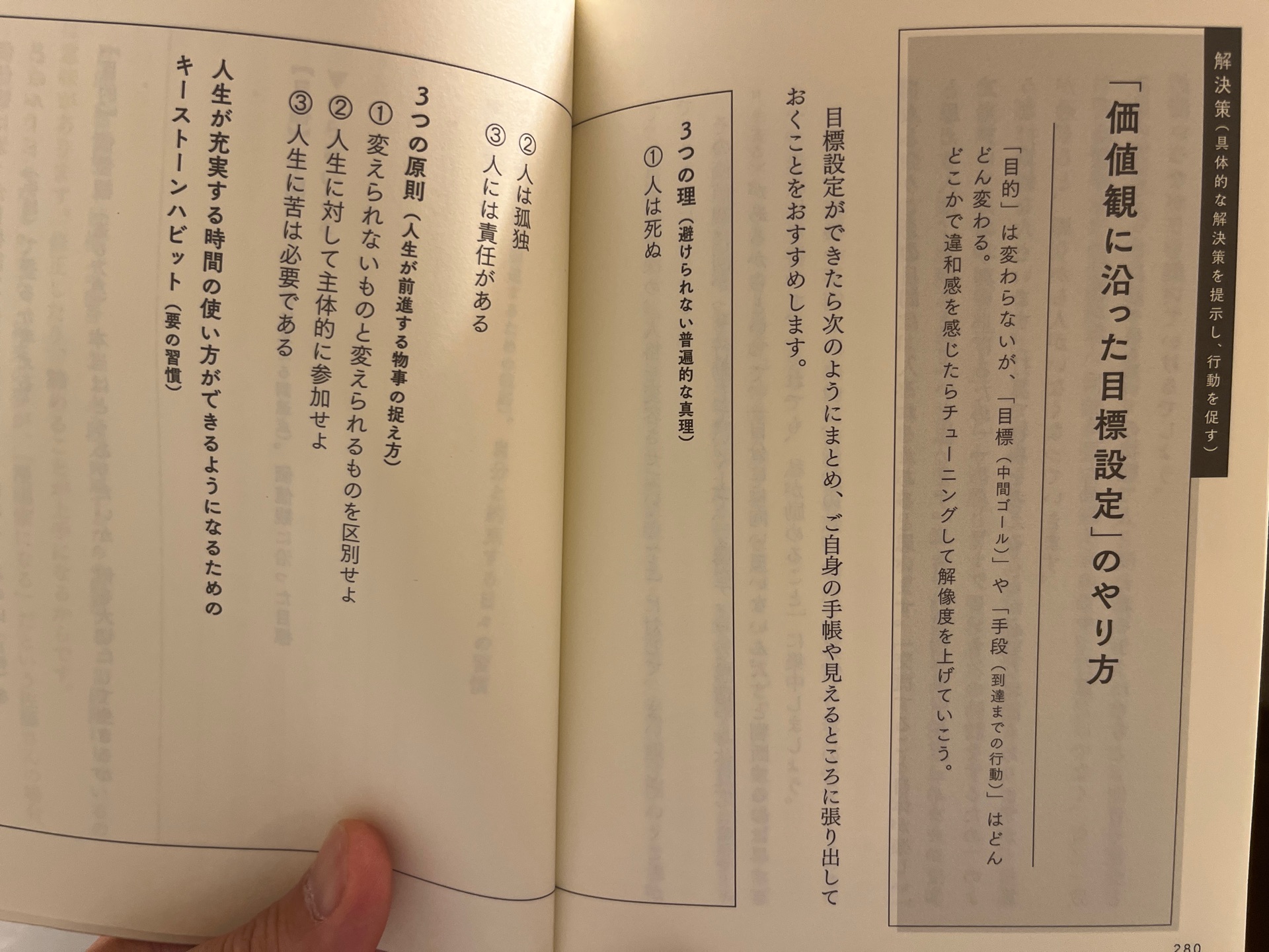 あっという間に人は死ぬから 「時間を食べつくすモンスター」の正体と倒し方佐藤舞(サトマイ)読み終わった自分の価値観を持つことができ、それに沿って生きられれば、人生が充実するだろう。自信も持てるだろう。 --- 有意義な時間の使い方とは 自分の人生の舵を自分で握ることとその覚悟、そして智慧を手に入れ、人生の3つの理(死・孤独・責任)を受け入れながら、人生をコントロールしていくこと タイムボクシング ・時間が決まってるタスク ・託すの詳細メモ ・時間が決まってないTodoリスト 人材の向き合い方と苦痛への処方箋:3つの原則 1.変えられないものと変えられるものを区別せよ 歎異しょう 2.人生に対して主体的に参加せよ 3.人生に苦は必要 人生で変えられるもの=認知と行動 認知を変えることで捉え方を変える 自分の本心、価値観の追求 自分にしか分からない、自分だけのもの 本心に従って行動する 価値観に合った目標を設定する 目的→目標→手段 目的=人生を通して大事にしたい価値観、方角なので抽象的で問題なし、少しずつ変わっていくもの 目標=こういう状態になっていたい 手段=具体的行動 「時間を食べつくすモンスター」の正体と倒し方 ・避けられない闇(死・孤独・責任)と向き合う ・闇を照らす月(かりそめの平穏)に惑わされない ・太陽(価値観)を見つけ、自分の人生に主体的に関わる