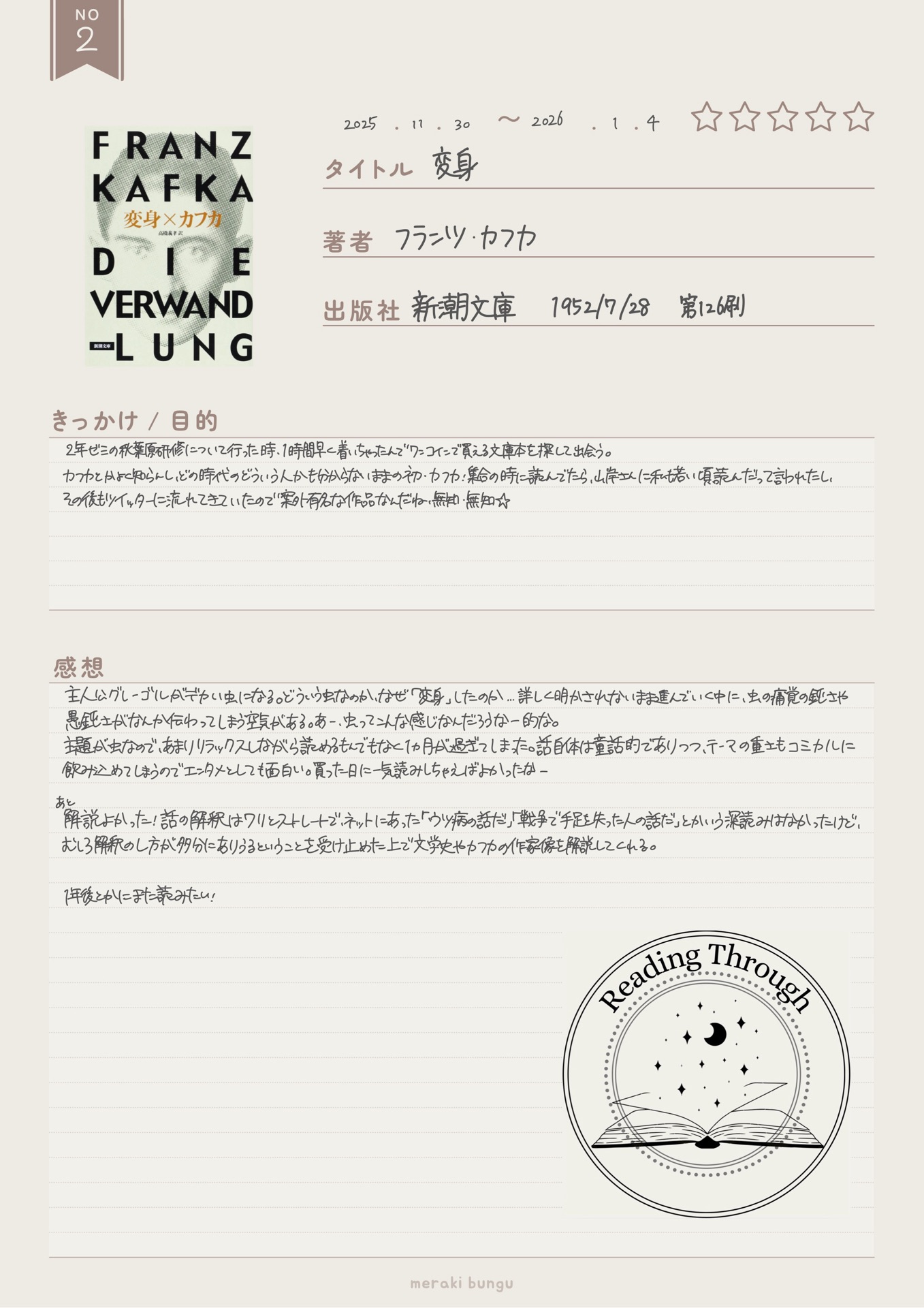 変身フランツ・カフカ読み終わったやるせなさ どうしようもできなさ この作品は現在でも非常に多くの解釈があるらしい。例えば鬱病で家族を養えなくなった人間、戦争で手足を失って「虫」のようになってしまった人…。ただし読み進めているときにはそんなリアリズムは介入する余地がないほど、虫であることの気持ちの悪さや痛覚の鈍さが直撃するような文章力があった。 解説も良かったよ!カフカの学術的な位置付けから入り、本作品や他の作品との比較などかなり大きい土俵で解説してくれてた印象があった。シュールレアリズムって絵画だけじゃなく小説という表現方式にも落とし込めるんだって意外。他の作品も読んでみよう〜