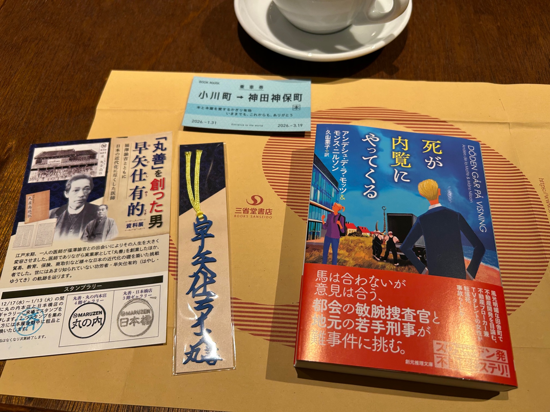 死が内覧にやってくるモンス・ニルソン,アンデシュ・デ・ラ・モッツ,久山葉子買った@ 三省堂書店 神保町本店(小川町仮店舗)今年、シリーズ2作目の『死んでもいいくらいの掘り出し物』が出る予定。 『死が内覧…』は版元の在庫僅少ということで。三省堂(小川町仮店舗)では平台に1冊だった。 丸善 丸の内店と日本橋店でスタンプを押してもらい、丸の内店の展示会場でノベルティを。「早矢仕ライス」の切り絵栞。笑 三省堂 神田神保町本店は、2022年4月から建て替え工事をしていたが、この3月19日にいよいよ完成、グランドオープン。 小川町の仮店舗は1月31日に閉店。それまでの間に買い物をすると、特製の切符型の栞をもらえる。これを持って新店舗に行くと、特別なスタンプを押せるらしいよ。