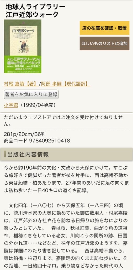 【POD】江戸近郊道しるべ村尾嘉陵買ったかつて読んだふと思い出したこれも今はPOD(print on demand) 紙の本は図書館でも閉架図書で貸し出し不可。大國魂神社のところだけコピーした。 後にPODで購入できると知り注文。 村尾嘉陵(むらお かりょう) 1760〜1841 清水徳川家(御三卿)の御広敷用人 九段に役宅があった村尾が、文化4年(1807年)から天保5年(1834年)までの間、勤めの合間に江戸近郊を訪ね歩いた日帰り記。 あー!思い出したぞ。村尾嘉陵を最初に知ったのは小学館 地球人ライブラリー『江戸近郊ウォーク』だ。こちらは現代語訳。後に『江戸近郊道しるべ』に改題、講談社学術文庫から出た。
