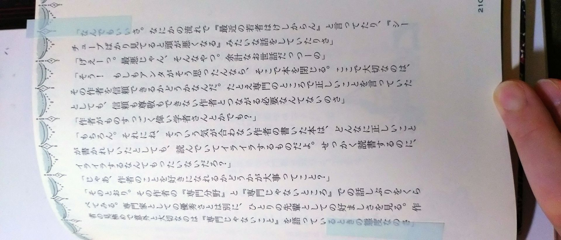 さみしい夜のページをめくれならの,古賀史健かつて読んだ「教養書(新書など)を読む時のコツ」のひとつとして「作者の専門のことと『専門じゃないこと』をくらべて読もう」というのを挙げていた。 「専門じゃないことって、具体的になに?」の例として「最近の若者はけしからん」「ようつべばかり見ていると頭が悪くなる」というのを、この本(ヒトデの占い師)は挙げていた。 ただの一例として挙げられていたけど、これを読んだだけでわたしも「うへぇ...」と思ってしまった...。 こんなのを読んで「そうだそうだ!」と共感する人なんているのかな...と思ったんだけど、例えばそういう事を書く(言う)作家と同じぐらいの年代の人とか、例えば考え方がすごく保守的な人とかが共感するんだろうな...。 いまのわたしは「うへぇ...」と思うような感性で本を読んでいるけど 歳を取って本を読んでいくうちに「最近の若いものはけしからん」論調に共感するような人間になっていくのかな...それはなんかやだな... そうならないように気をつけたいな...