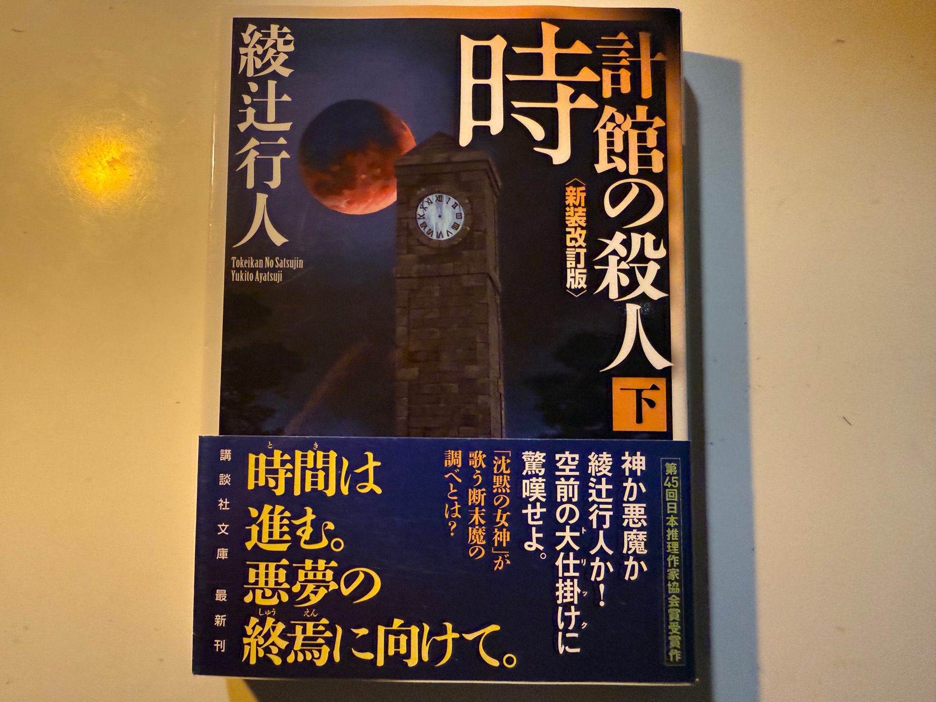 時計館の殺人<新装改訂版>(下)綾辻行人読み終わった買った下巻は書影が夜。今月末からドラマ配信があるようなので先に原作を読んでおくことにした。十角館に続いて江南くんと島田さんが出てくる。 【読後追記】 一日経たず上下読んでしまった。トリックや真犯人についてはしっかり伏線を張られており、すぐに見当がついた。 しかし、どうしても納得がいかない点がいくつかある。 ・時間が1.2倍の早さという設定はちょっと無理がある。 旧館に入った時点で時計たちの脈打つ音が正常なBPM60のテンポからするとかなり早く感じるはず。 そこに誰も気づかないのは強引だと思う。 ・犯人が死体をどうやって上まで運んだのか。 成人ひとりをかついではしごを登るなんてどうやったらできるんだろう。とんでもない体力怪力おばけである。 他にも細々とつっこみどころはあったけれど、この話は時計館の初代当主である古峨倫典氏の執念の物語だということが強く刺さった。 やはり中村青司に建築設計の依頼が通った人はぶっちぎっている。 Huluでの配信まで一週間ほどなので間に合ってよかった。今回はどんな風に映像化されるのかも楽しみ。 ずとまよが主題歌担当なのも嬉しい。
