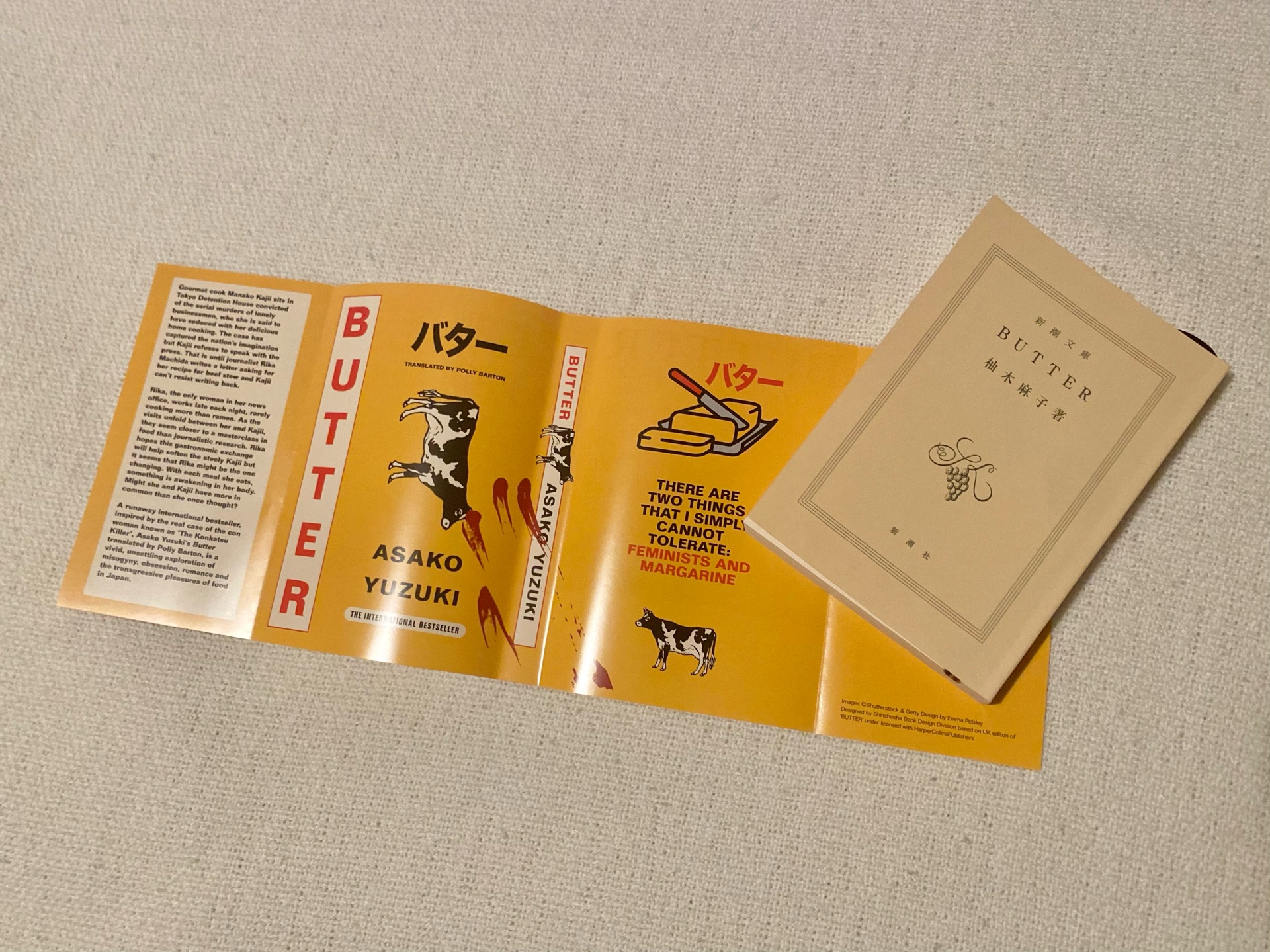 BUTTER柚木麻子読み終わった買った殺人事件の容疑者に女性記者と共に翻弄され、官能的にも感じる食べものの描写が溢れる、寒い日にぴったりな濃密な小説でした。終始バターの虜。 新潮文庫の日英リバーシブルカバー仕様のPOPに惹かれて。イギリス版の装丁がバターの箱のようでかわいい🧈🐄