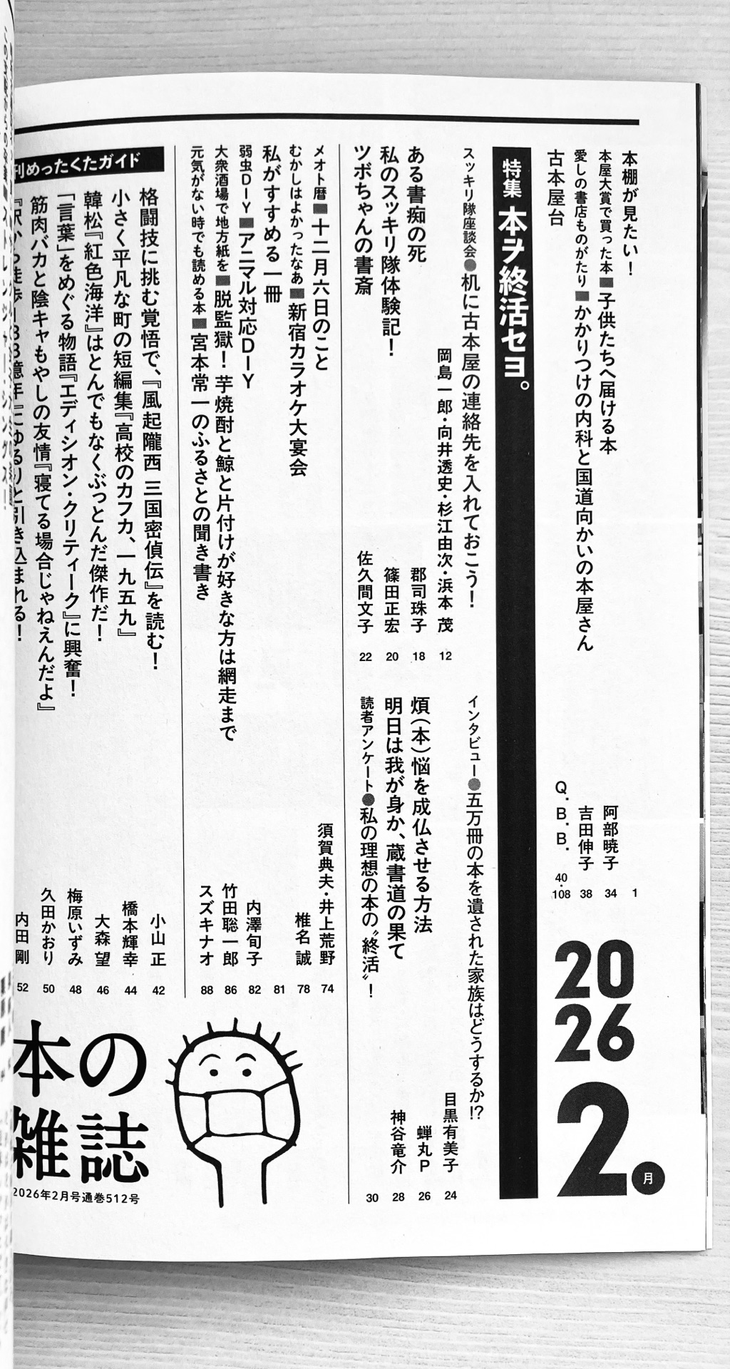 本の雑誌512号2026年2月号本の雑誌編集部読み終わった本を溜め込んで亡くなったらどうなるのか?本に理解ある家族でさえも苦労する様子が載っている。古本屋も全てを処理するのは難しいだろう。そもそも古本屋が近くある方も少ない気がする。リアルな教訓が多く、蔵書家必読の特集号だ。