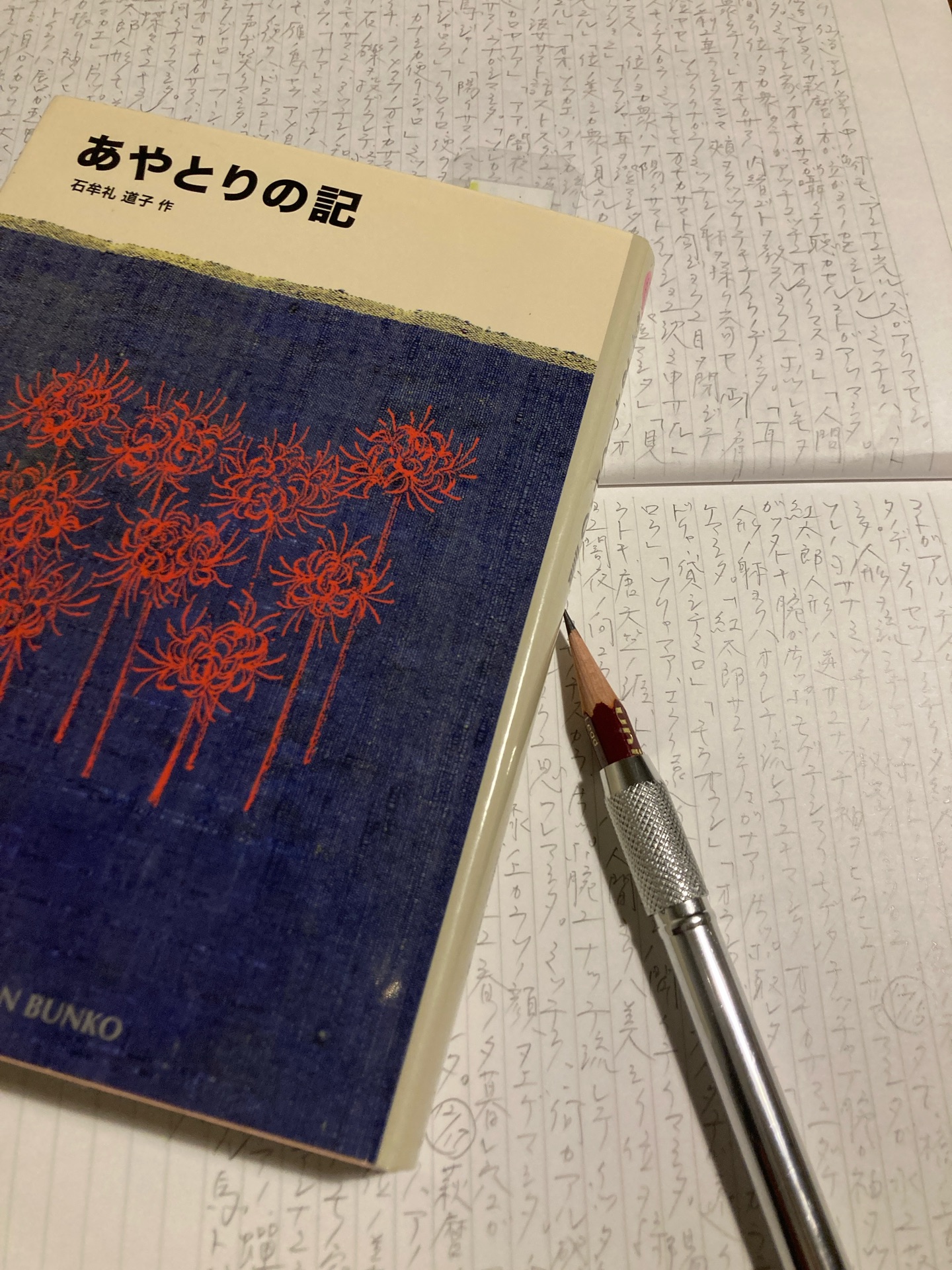 あやとりの記石牟礼道子全文筆写、続行中. (第五章 ひかり川 231頁3行迄) どうして どうして こんなにも美しい...浄福、祈りのことば 来春の読書会では石牟礼道子を通じて様々な人たちとことばを交わしてみたい. ____________ (萩麿も、位の美しか衆のひとりかもしれん)みっちんの耳にはそのとき、天の山々のあちこちで、もの寂しい、澄んだカナカナ蝉のような声が聴こえていました。萩麿の眸が、あんなにものやさしいのは、ひょっとして、どこへ宛てて出したらよいかわからないあの、蝉の声のような便りを、聴きとっているからかもしれません。川の中に立っている馬と仙造やんを包んで、明るくて寂しい光が降りてきつつありました。 ____________