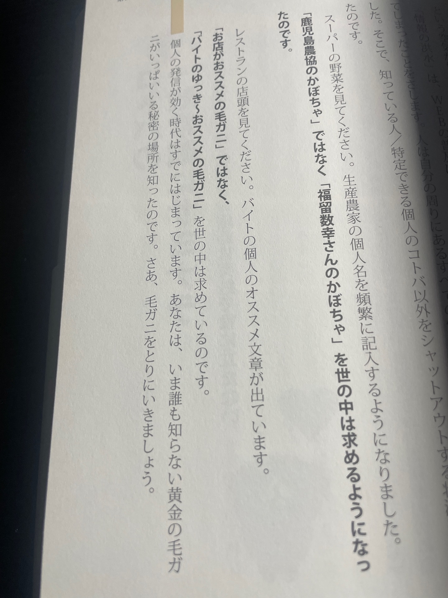 伝え方が9割佐々木圭一学び!読んでる@ 自宅2章の終わりまで。 会話術としてためになる話が多いのはもちろん、実用書ならではの堅苦しさがなく、スラスラと読むことができる。 コトバの本で毛ガニの話題になるとは思ってなかった。。。 『さぁ、毛ガニをとりにいこう』