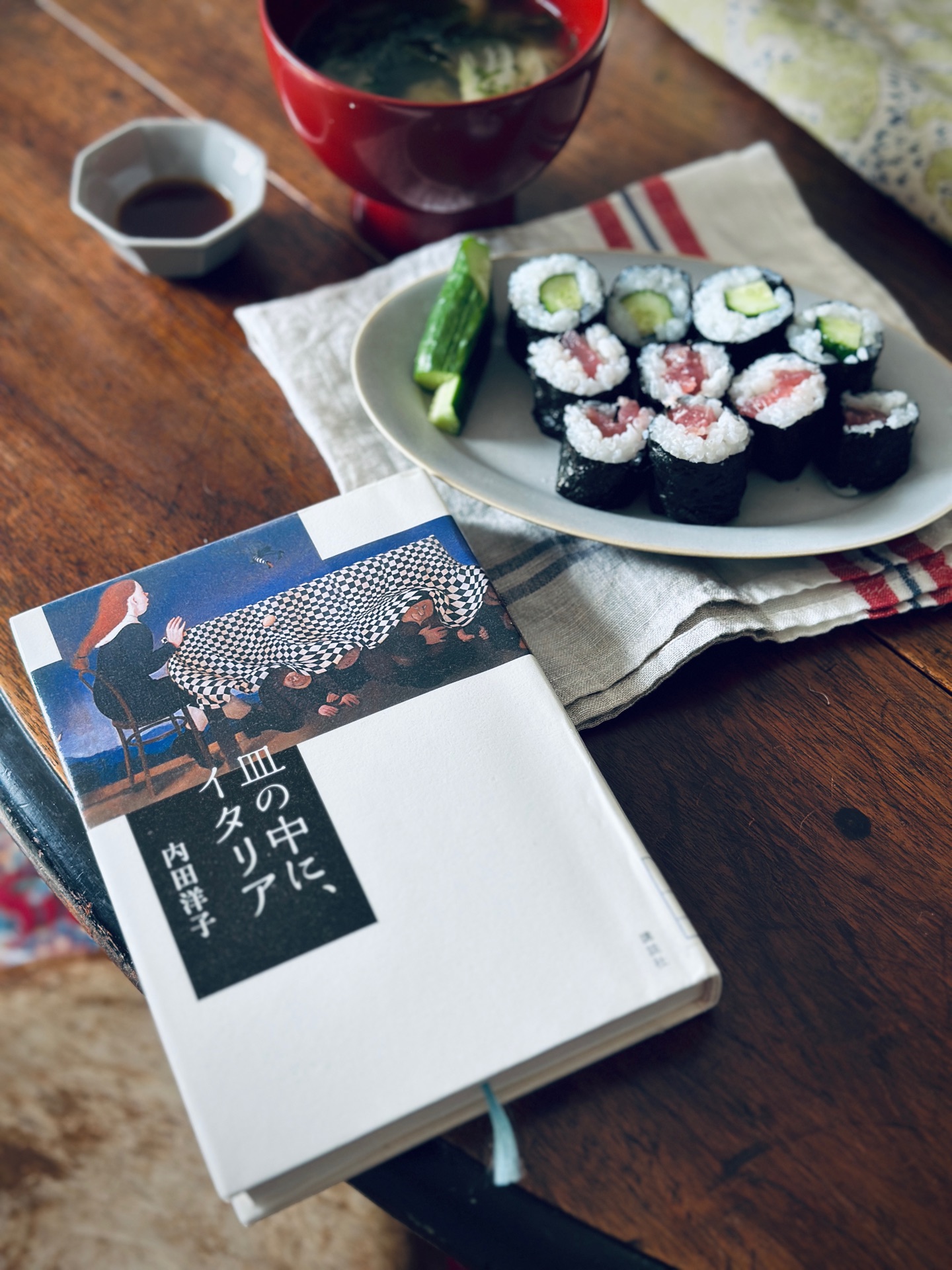 皿の中に、イタリア内田洋子イタリアの食と人を巡るエッセイ。とても良い。が、読み終える前に返却日が来てしまった。延長して借りよっと。 今日のお昼は海苔巻き。香典返しでもらった海苔があったな、と思ったら、旅館で出てくるような小さいサイズだった。つなげて巻いた。