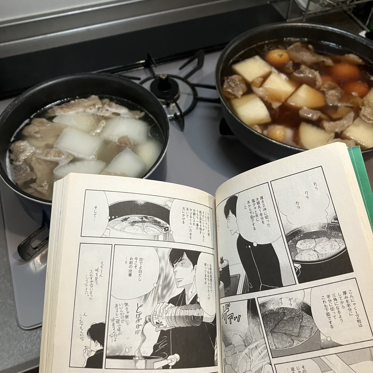 きのう何食べた?(8)よしながふみふと思い出した持ってる明日の夜に食べるおでんを仕込んでいて、シロさんのことを思い出した。 牛すじと大根と卵を、とりあえず今夜から仕込んでいる。ホントはこんにゃくも一晩寝かせておきたかったけど、買い忘れちゃったので明日朝のうちに買ってきて一度火を通さないと🍢練り物入れるのは食べる前で良いよね。入りきらなそうだったので鍋を分け、味付けもついでに分けてみた。ひとつは静岡出身の友人が教えてくれた濃口醤油を使った味付けにして、もうひとつはシロさんの真似をして白だしをドボドボ(8巻,p33)…いや、私はトポトポくらいにしておいた。 「きのう何食べた?」は、大分に住んでいた頃に「ばんぢろ」という誰かの家みたいな喫茶店に置かれていて手に取り知った漫画。ケーキを食べて珈琲を飲みながら色んな本をパラっと読んだり、お庭でシャボン玉できたりするとっても素敵なお店だった。
