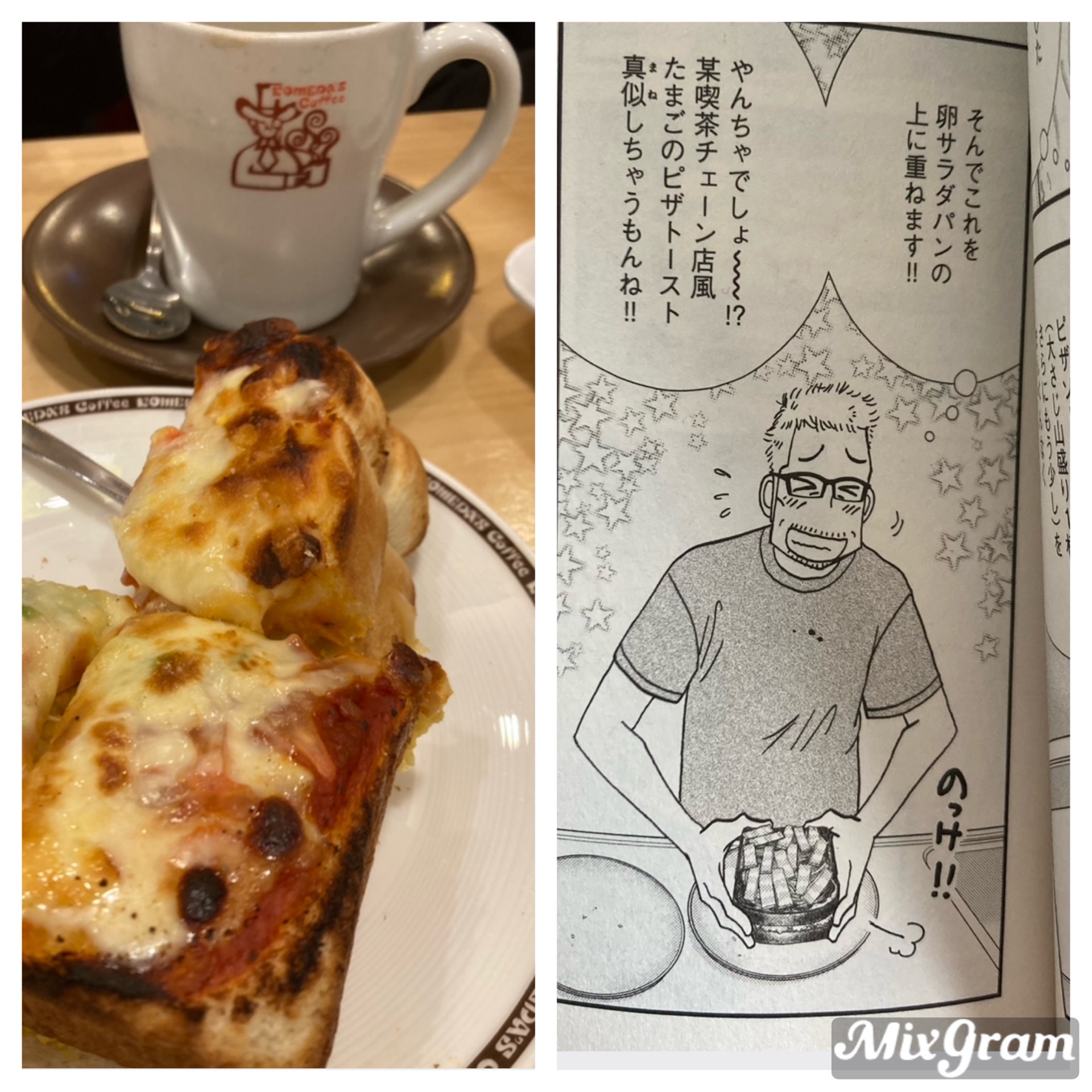 きのう何食べた?(21)よしながふみ持ってる教えてもらったコメダでたっぷりタマゴのピザトーストを頼んた。到着したものを見て長男が「ケンジが真似してたのこれか」と。 おうちに帰って21巻ピザトーストのエピソードを読み返したら、確かに🫨こんなギルティなものおうちで作っちゃうなんて愛が深いわね、ケンジ。